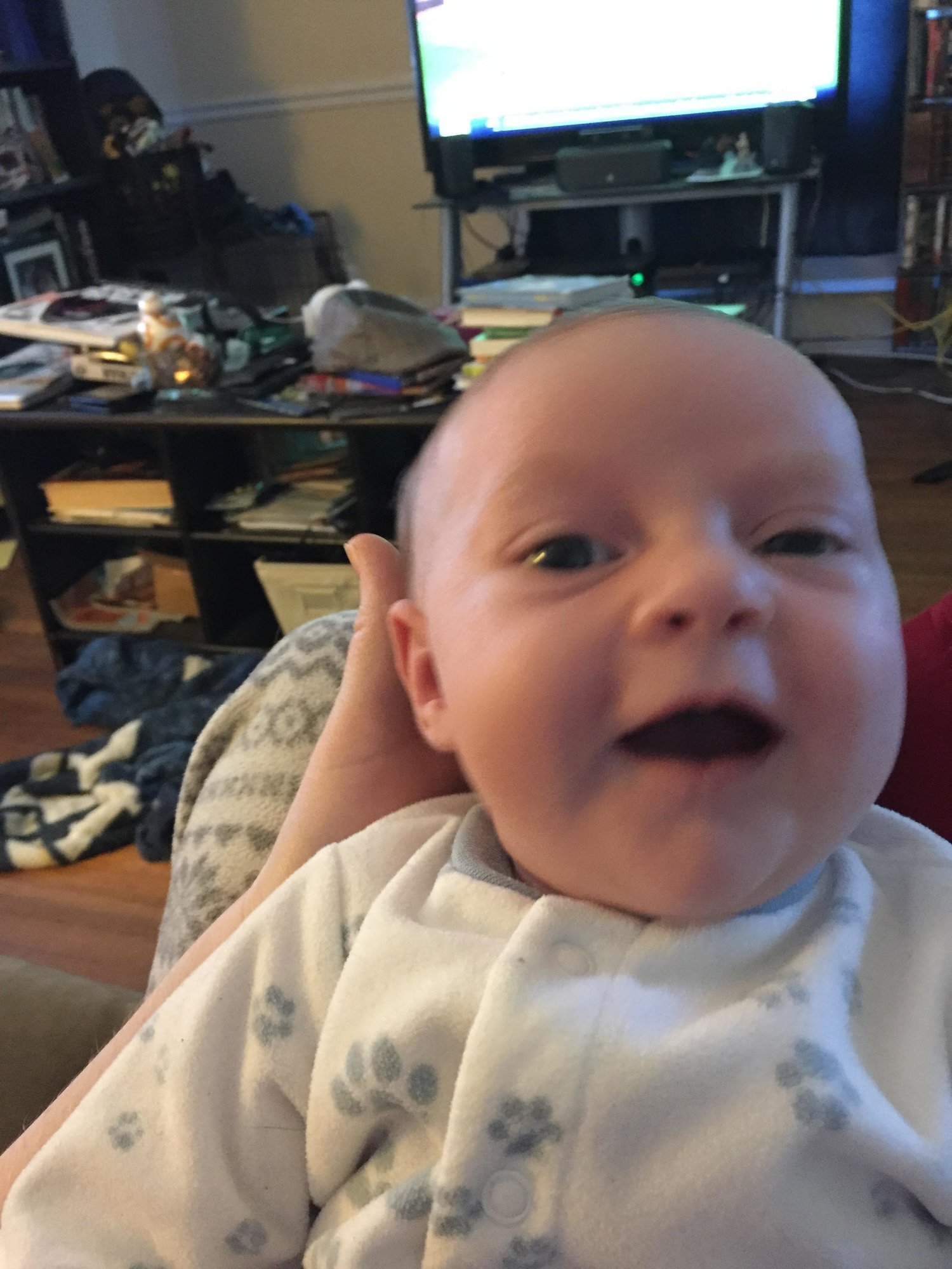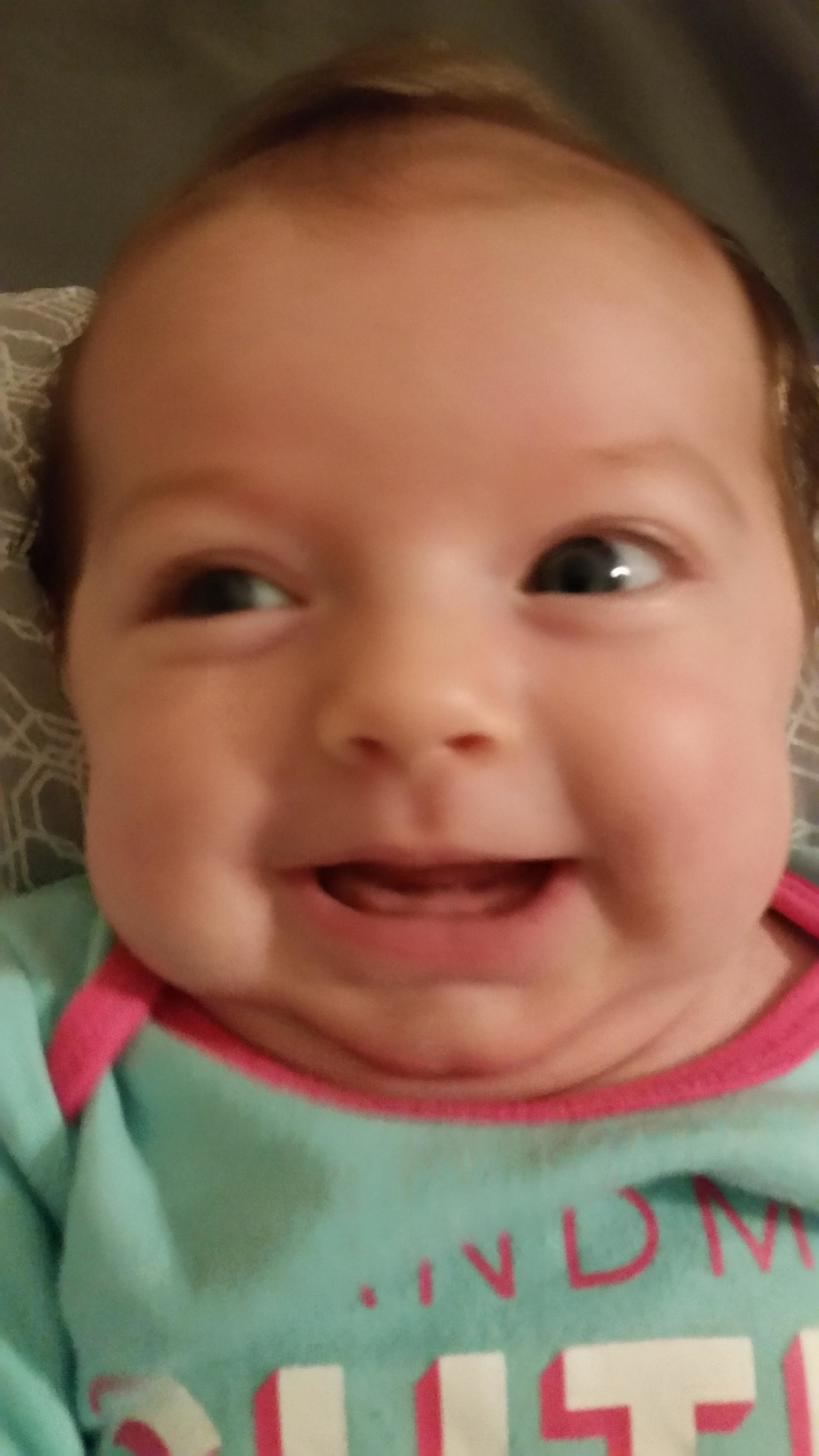 Addy figured out smiling a week or 2 ago, but I finally got one on camera! (That onesie was an appropriate pick this morning!)