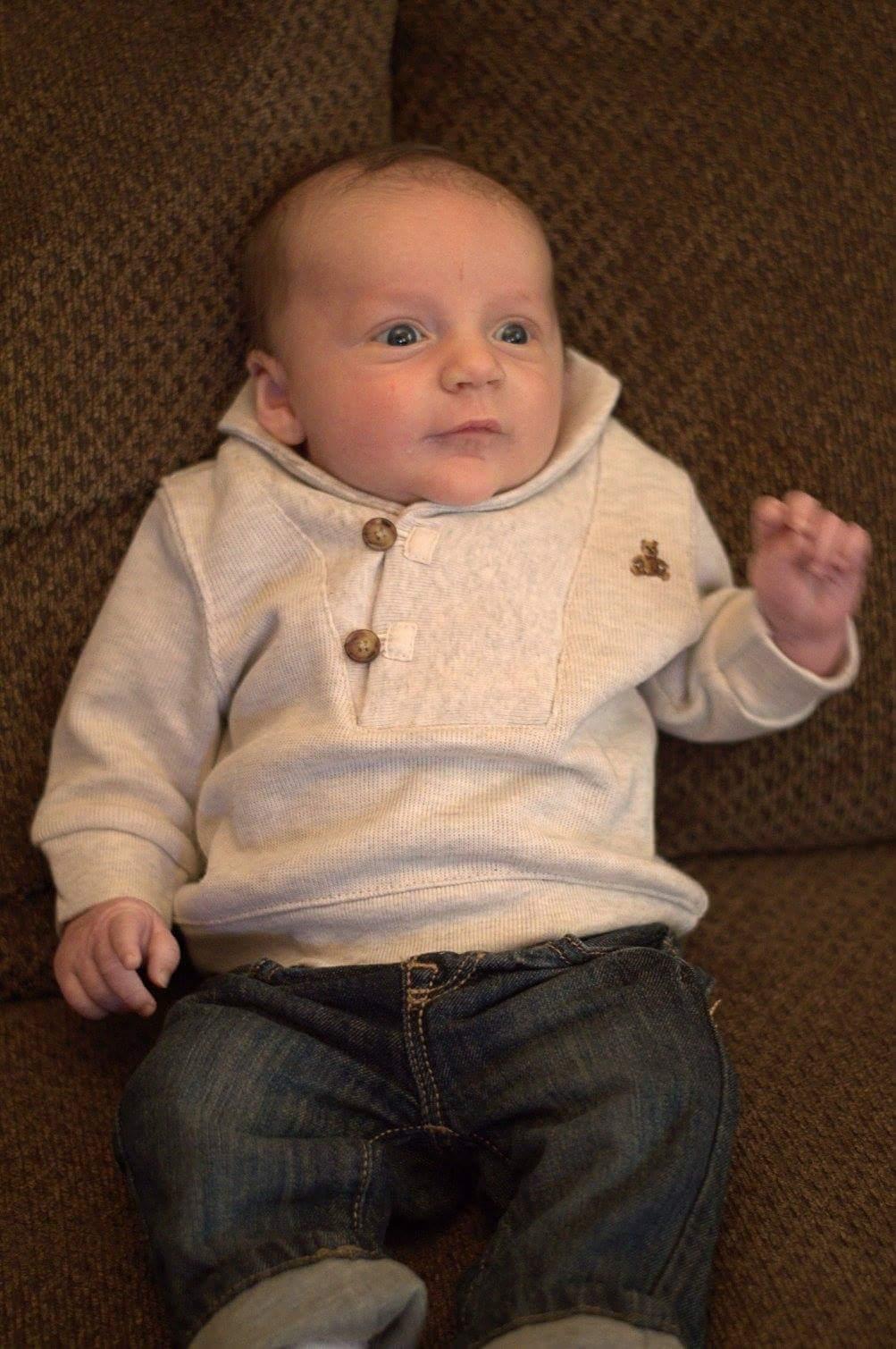 Barrett turned 8 weeks yesterday and decided he would celebrate by being wide eye awake from 1-3am, very unlike him. He also weighed 14 lb 14 oz at his appointment yesterday. Where did my little baby go?