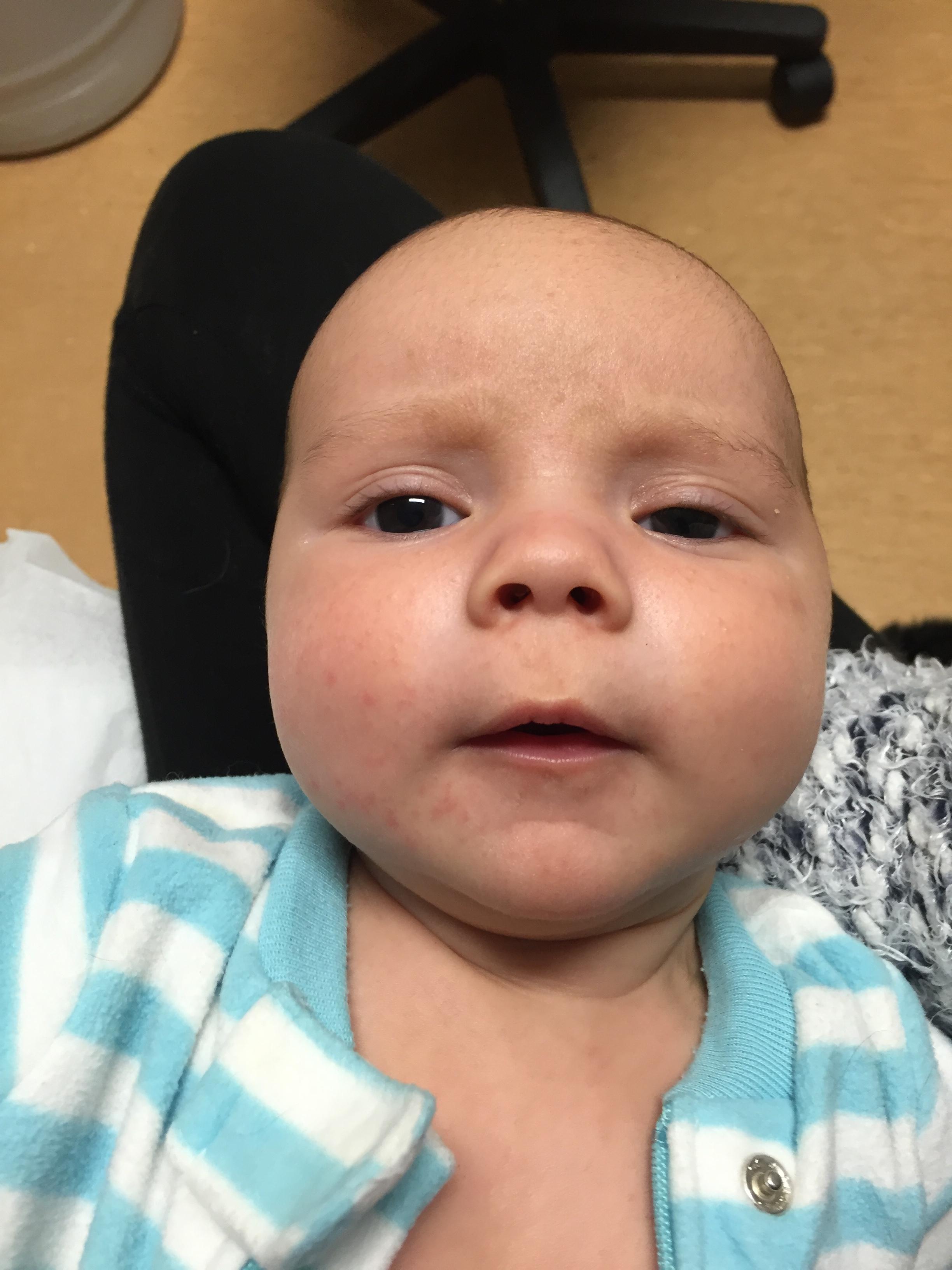 Brycen had to go to the doctors today because he's had a fever He's feeling better and we found out he weighs 11.5 pounds and 2 months on the 17th. Bottom pic is daddy teying to keep him entertained since he just unwillingly got a thermometer up his bum lol