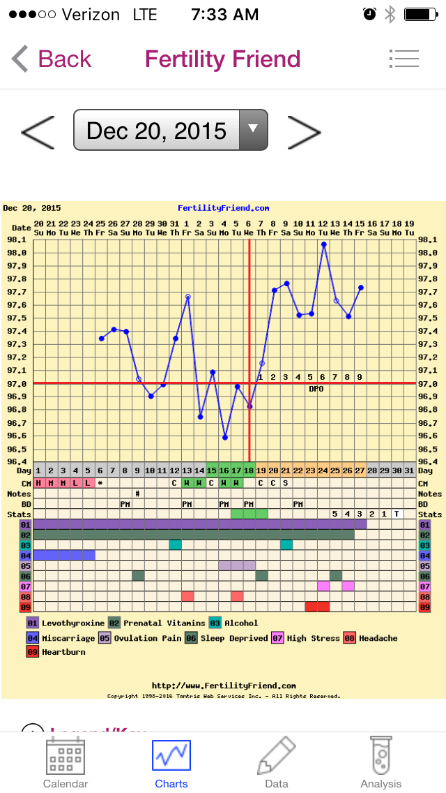 R/R/CS: My chart is messed up this month and I don't trust FF's CH. My temp, CM and secondary signs (to me) all point to O on CD 21, but I used a space heater and got my bedroom really hot on CD 20 and 21 so those higher temps threw my chart off. If I Oed on CD 21 then I'd be a bit more optimistic with -4, -2, -1 timing. I'm hoping that sperm survived long enough to catch that egg!
