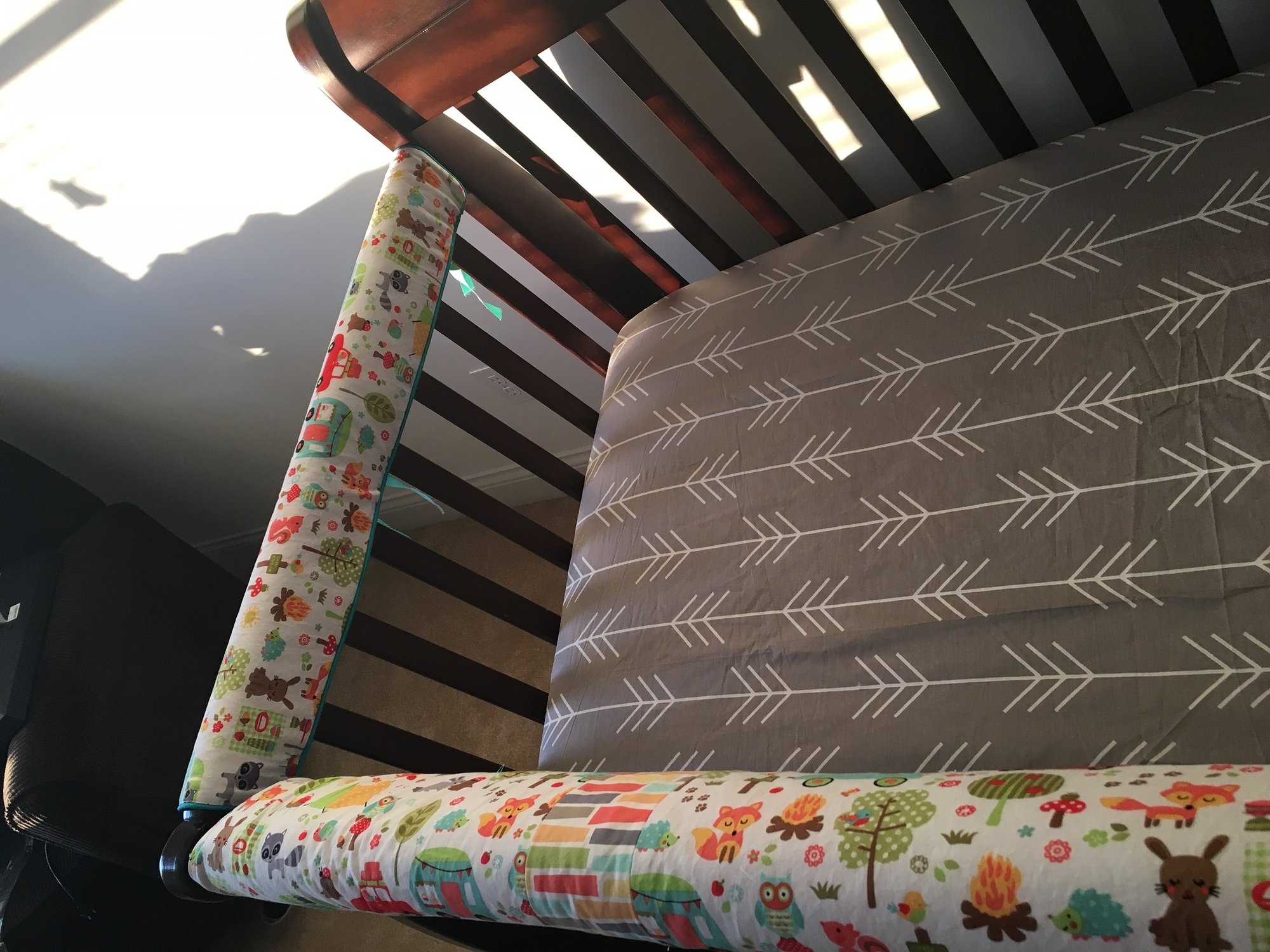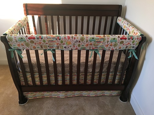 I made my own bedskirt and teething rails. I wanted a woodland theme, but wanted something more "whimsical" what I was finding. I found this fabric and dh and I fell in love with it. I'm love how great it turned out and can't wait to paint the room now.