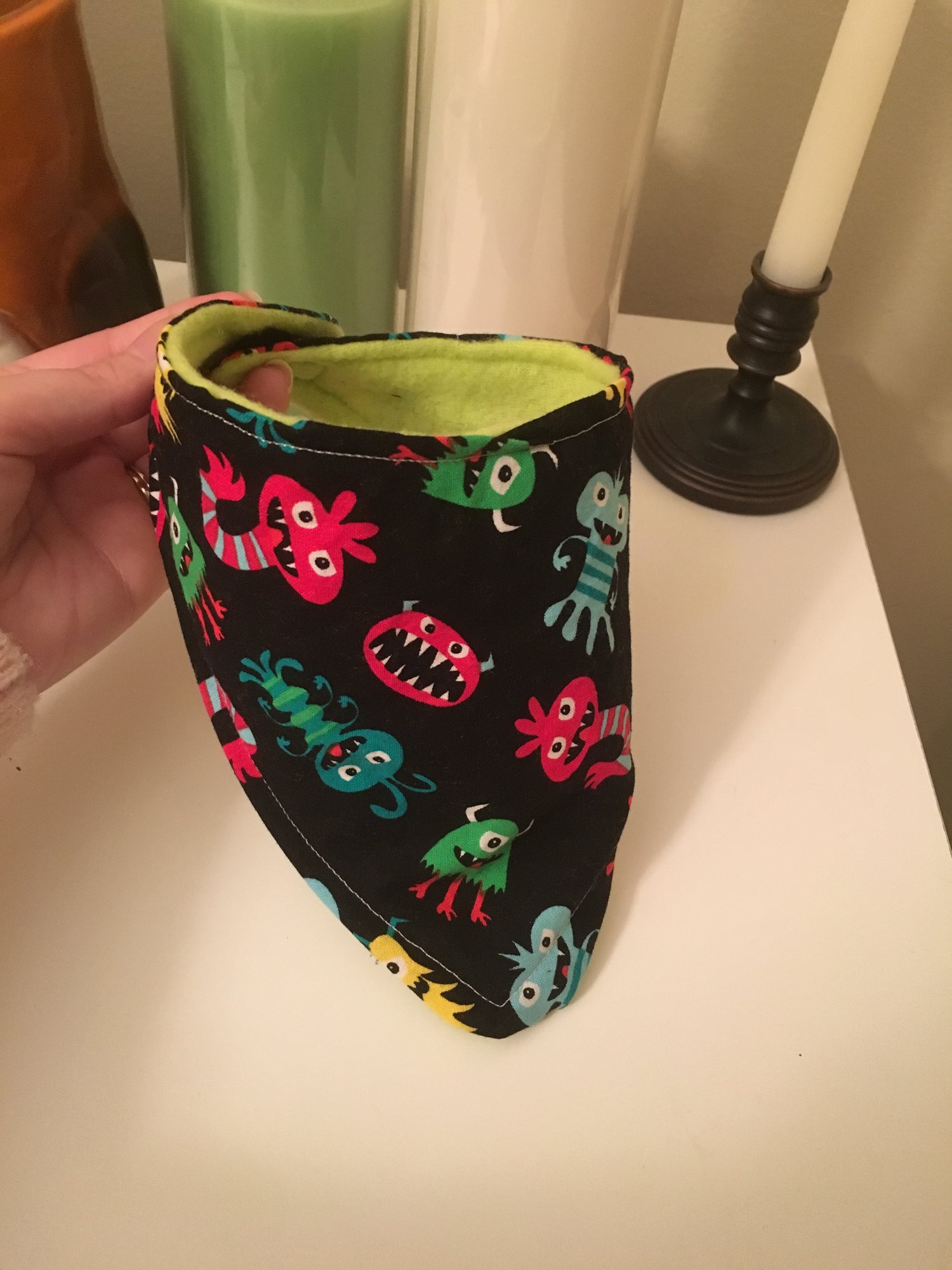 Dusted off the sewing machine again...only my third time ever using it. I have to use this fabric I went out and spent money on. Ugh. I made a bandana bib, which didn't turn out awful. Straight lines are my friend.