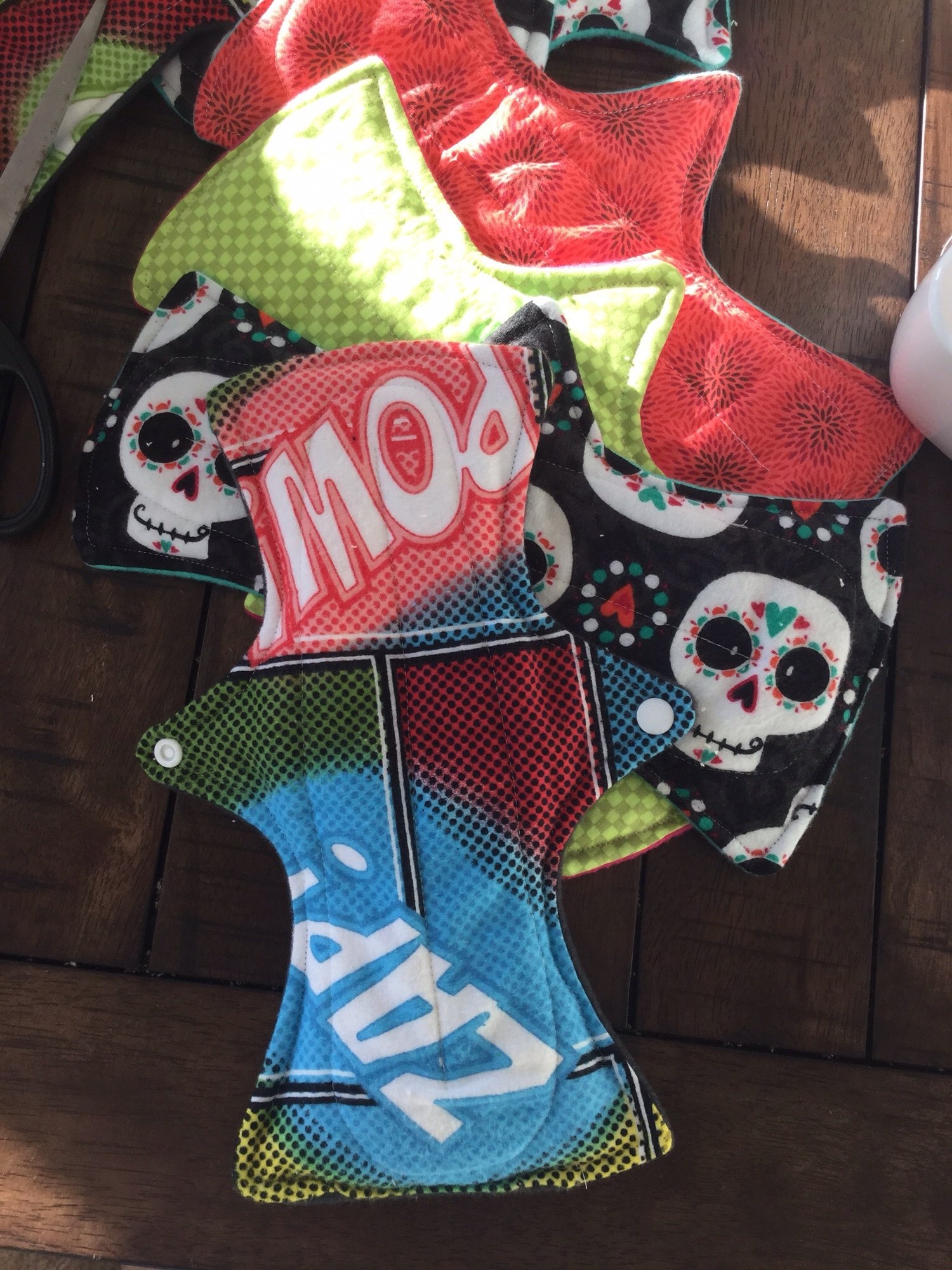 @elenabrent I have a diva cup but I prefer pads so I just modified my regular cloth pattern to be huge! If you're laundering cloth diapers cloth pads should be nothing to toss in with them. Fleece bottom, hidden layer of PUL to waterproof, terrycloth absorbent layers X3, *flannel tops. I'm making 20 to do laundry every other day. I was told 8-10 over night pads for 2-3 weeks. Honestly I just loathe the idea of adult diapers. Having big cutesy fabrics in my panties is better for morale!