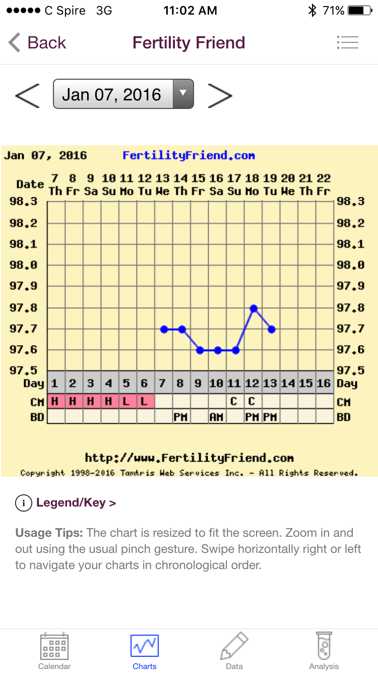 R/R/CS: Doing all right so far. A little anxious that this cycle will be wonky like the last one and that my uber predictable 29-30 day cycles are no more. Also feeling a tad frustrated that I've been having such trouble pinpointing O - I wasn't able to get a clear temp shift with my old thermometer, CM was working pretty well for me but with unpredictable cycles it's tougher to rely on that, OPKs failed me last time and I no longer trust the clear blue digis, etc. etc. etc. Some of these things I can rectify (I have high hopes for my new BBT for one), but I'm just a bit mad at myself and my body that I'm 6 months in and don't have a stack of pretty shifting charts and a clear idea of how long my LP is. It's extra frustrating because DH is starting to travel for work much more often and I want to give him a heads-up for my FW so that he can plan around it if possible. Oh well. Whine over - FX for the new BBT and for predictable cycles to return.