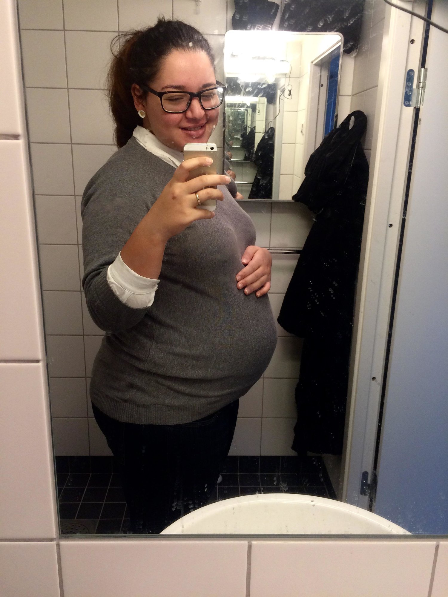 Not dressed and quite exhausted so here's a picture of me from yesterday, LO has moved so sadly I can't show you guys the funny bump I had, but my bump still looks quite pointy under the sweater. I have also reached the point where my white shirt no longer covers my belly.