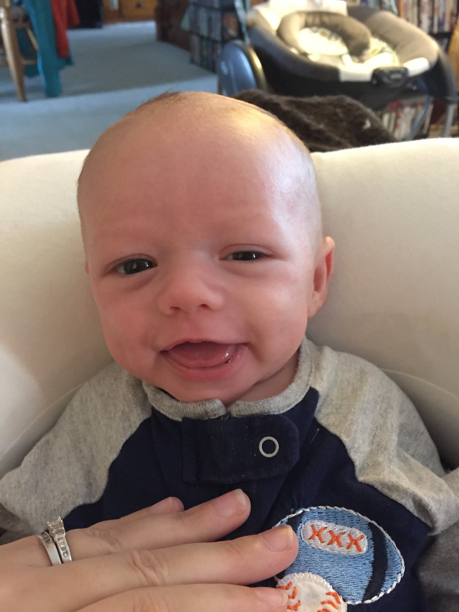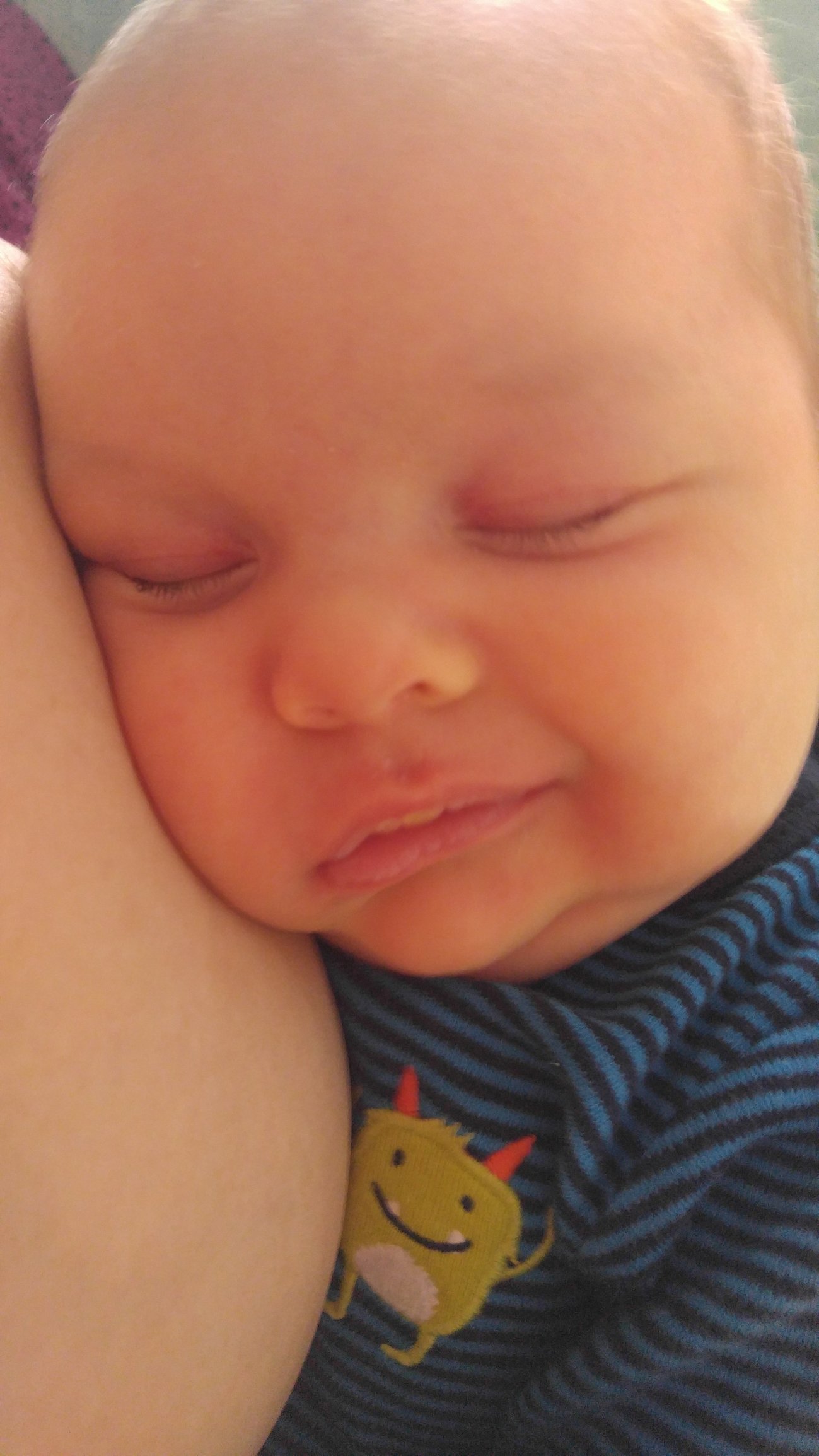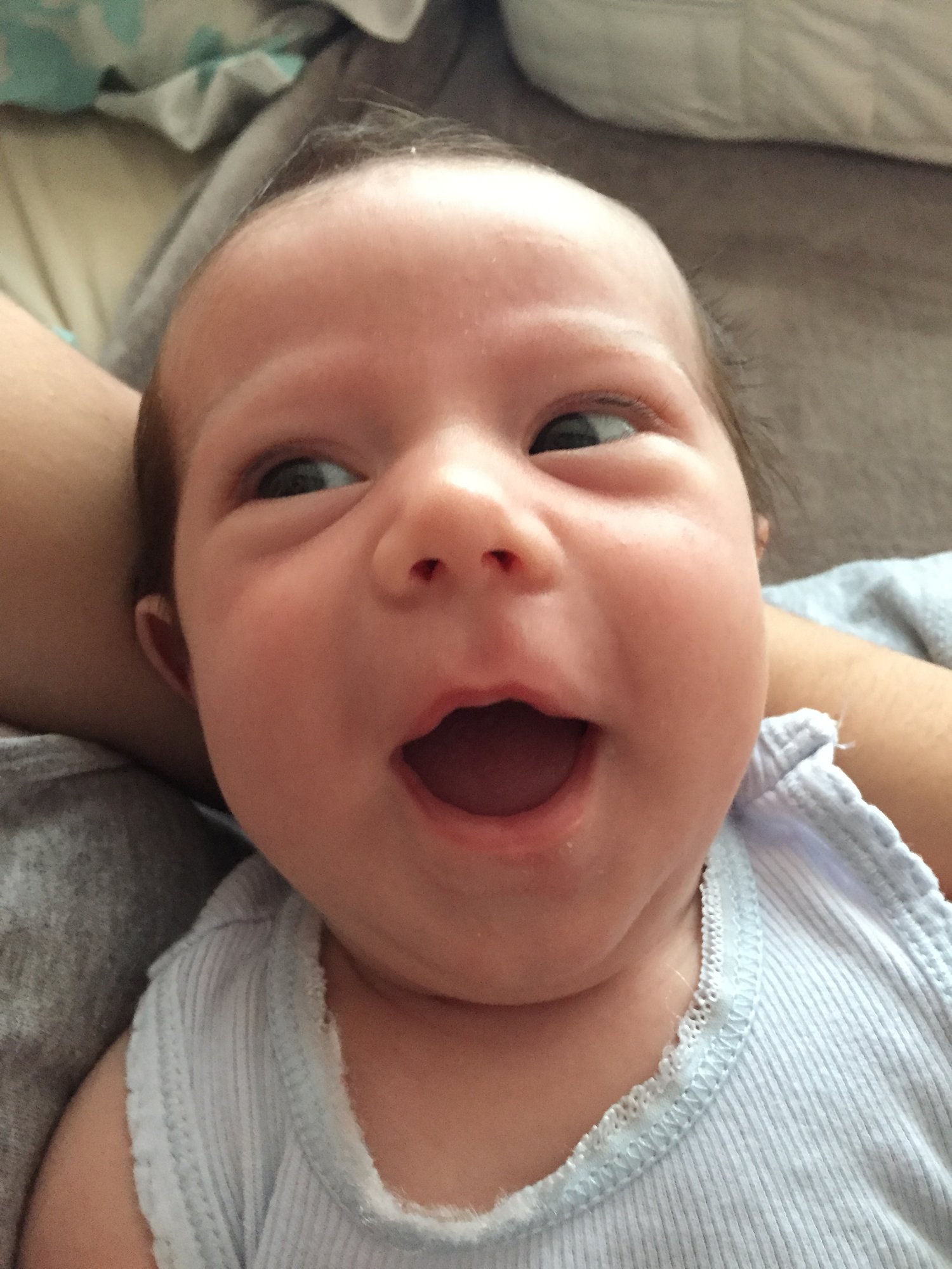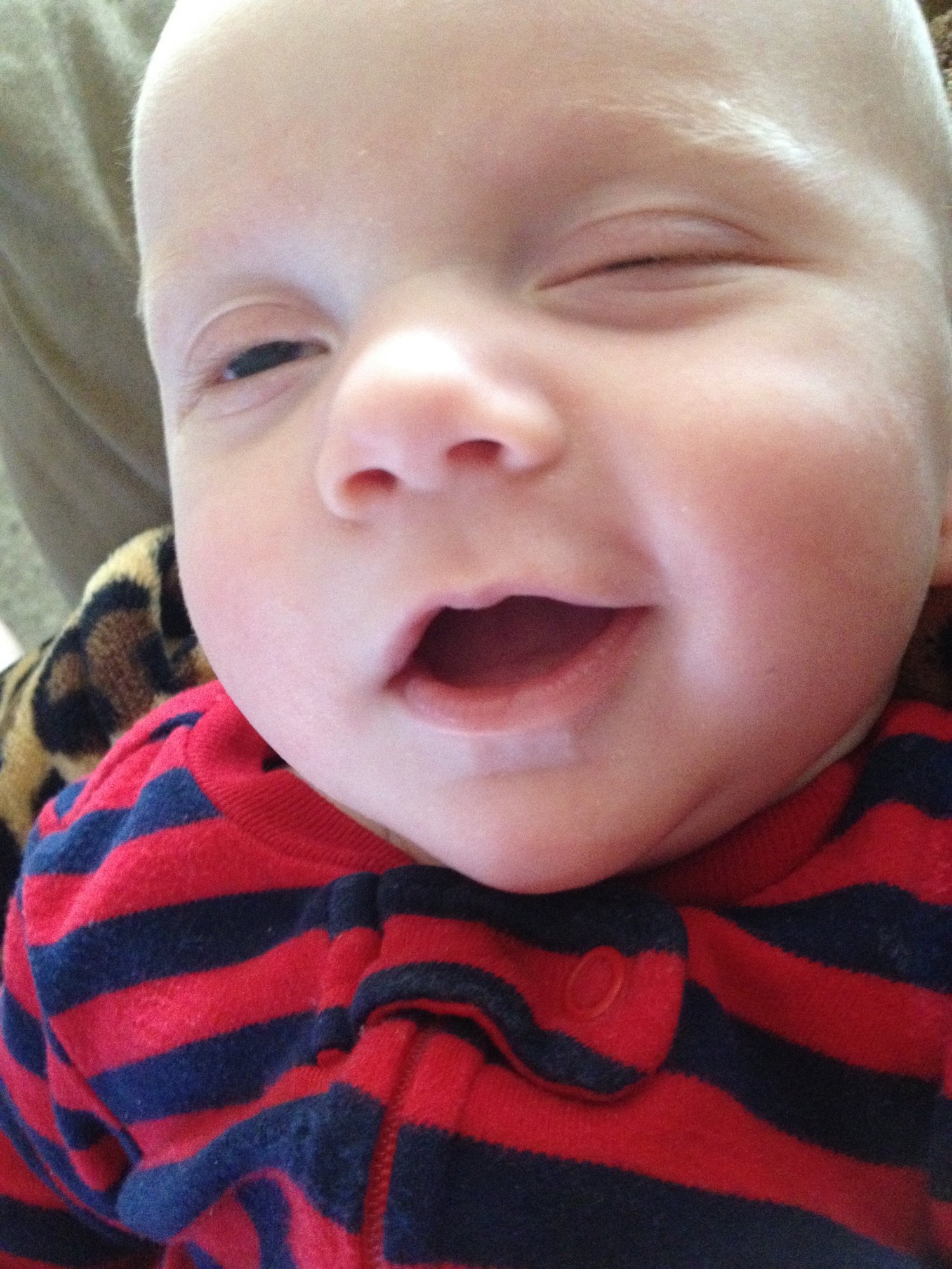 I can only get a smiley picture when he's milk drunk, even though he laughs and smiles all the time. As soon as he sees the camera he clams up and tries to stop like in the second photo. Little booger.