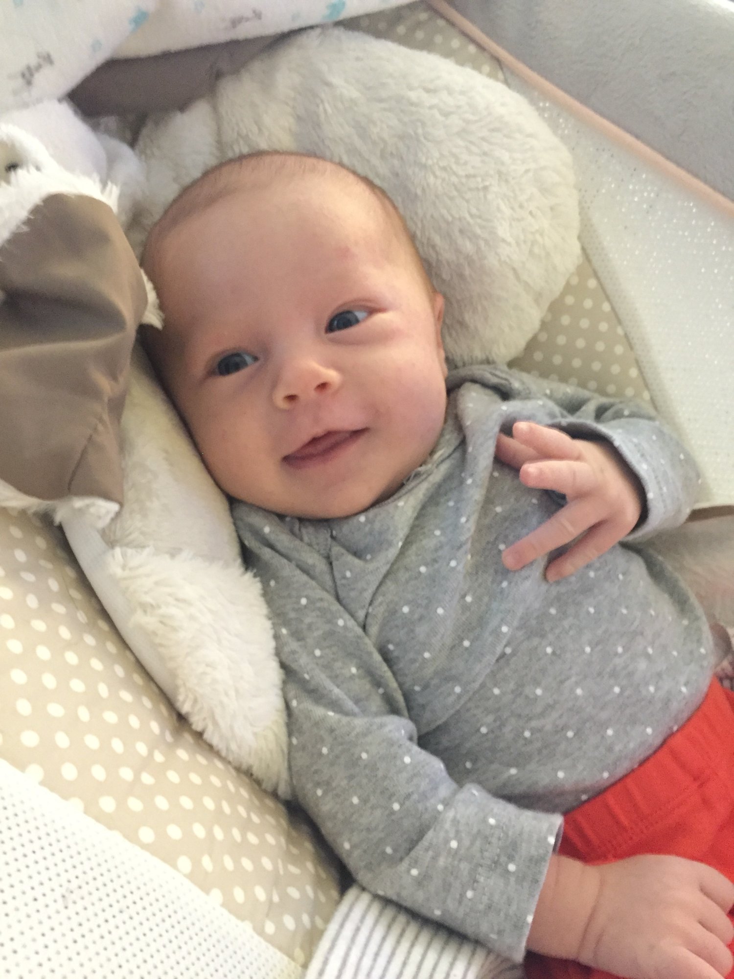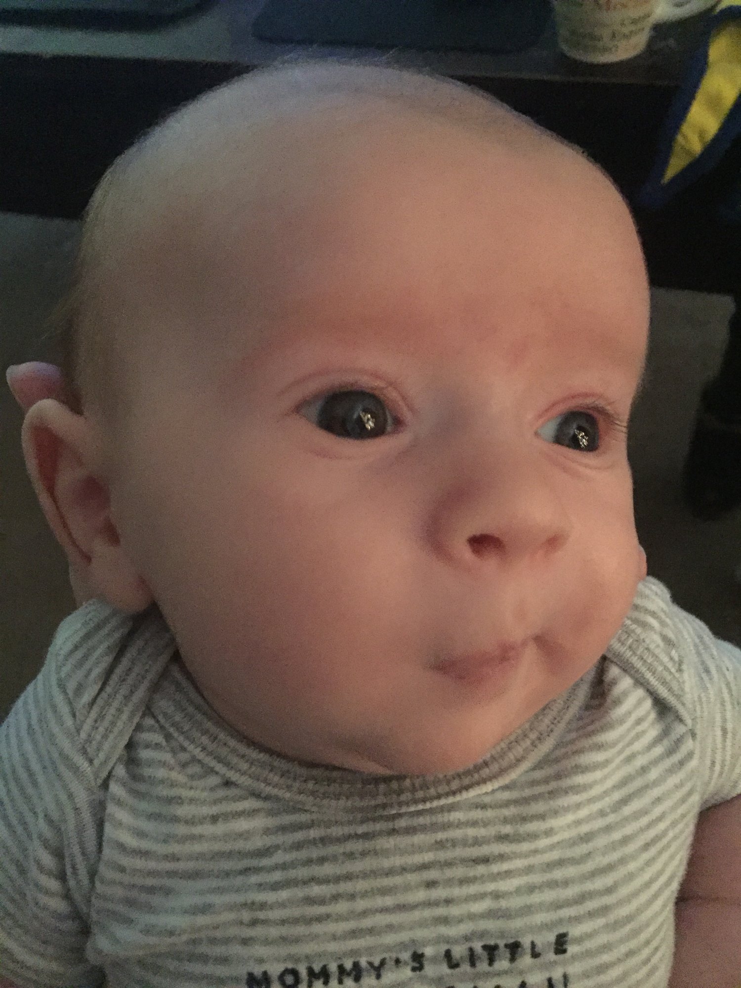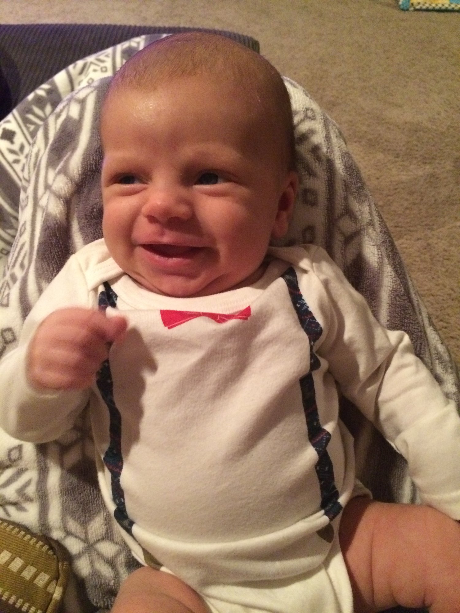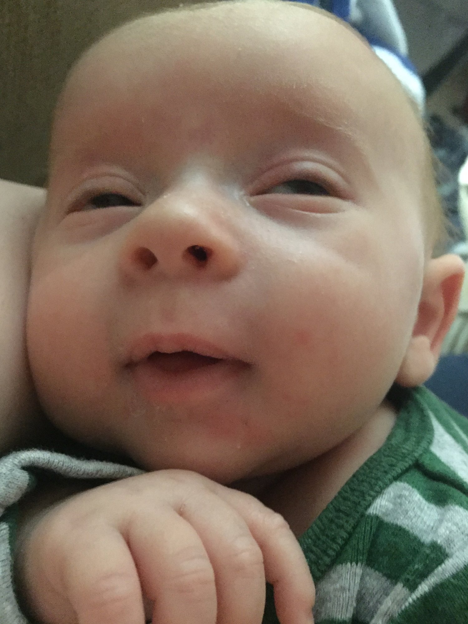 I can only get a smiley picture when he's milk drunk, even though he laughs and smiles all the time. As soon as he sees the camera he clams up and tries to stop like in the second photo. Little booger.