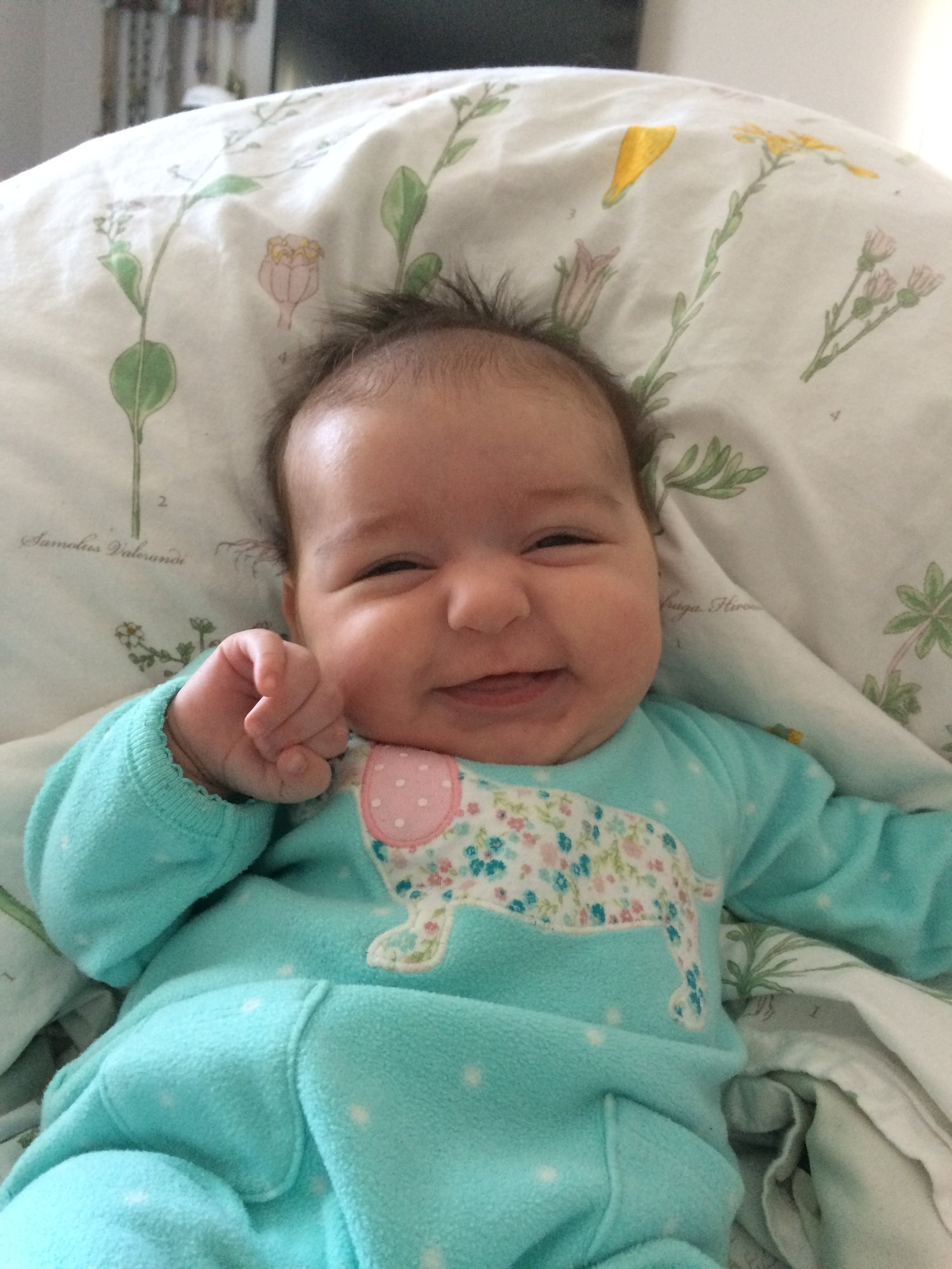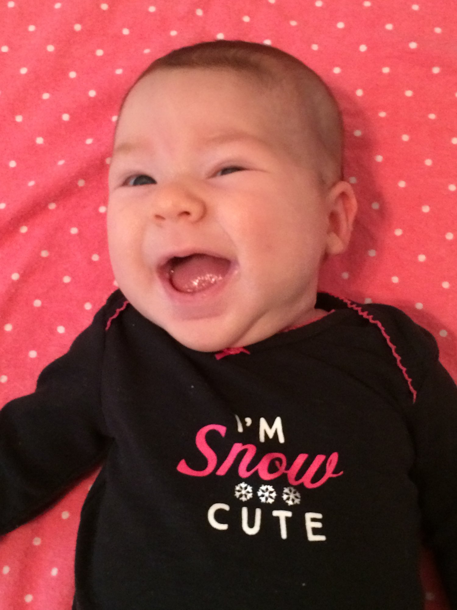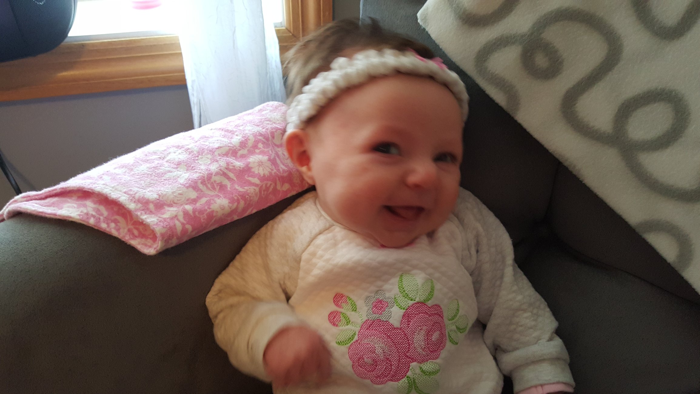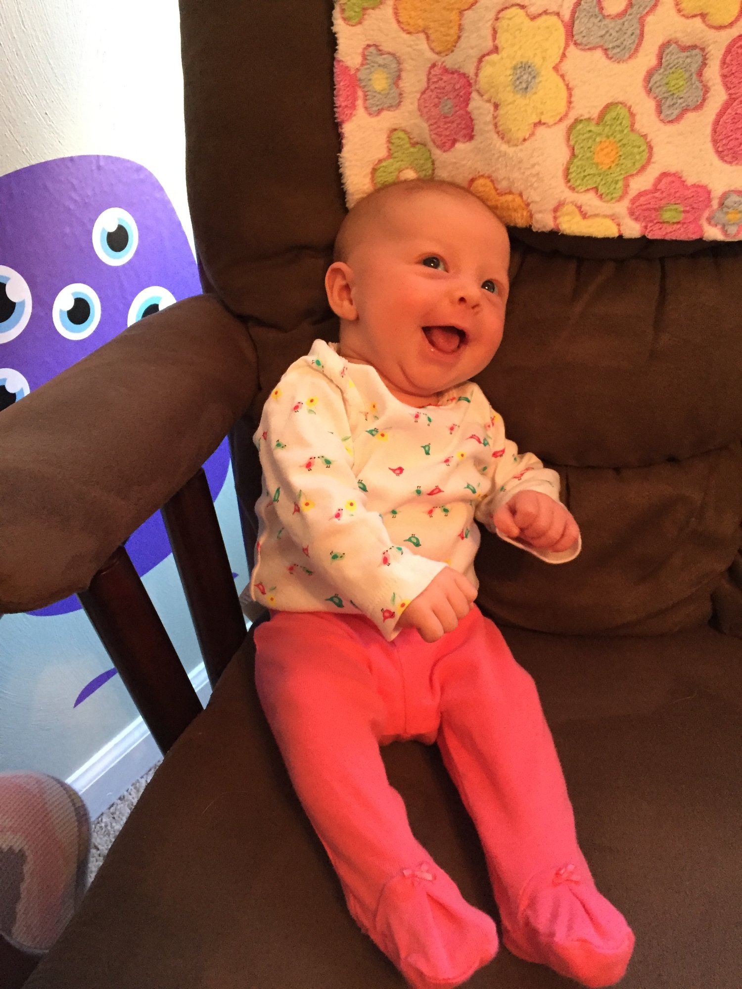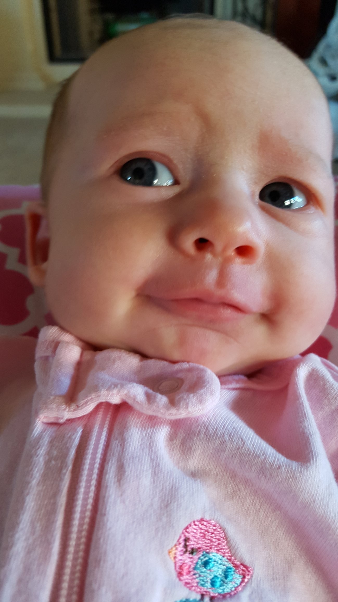 Riley doesn't really smile very much yet but we have gotten these so far. She is always scowling so daddy was gonna make a sad face with her and she ended up cracking a smile instead!