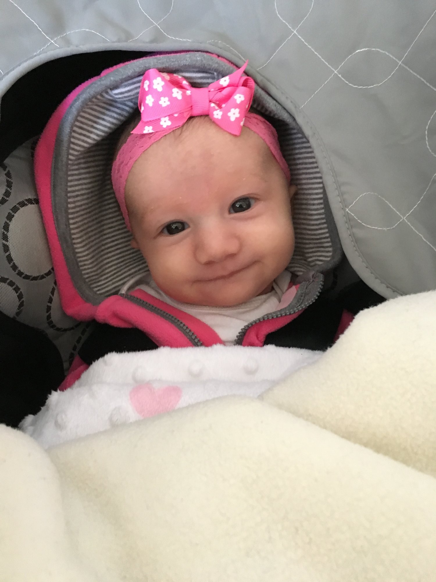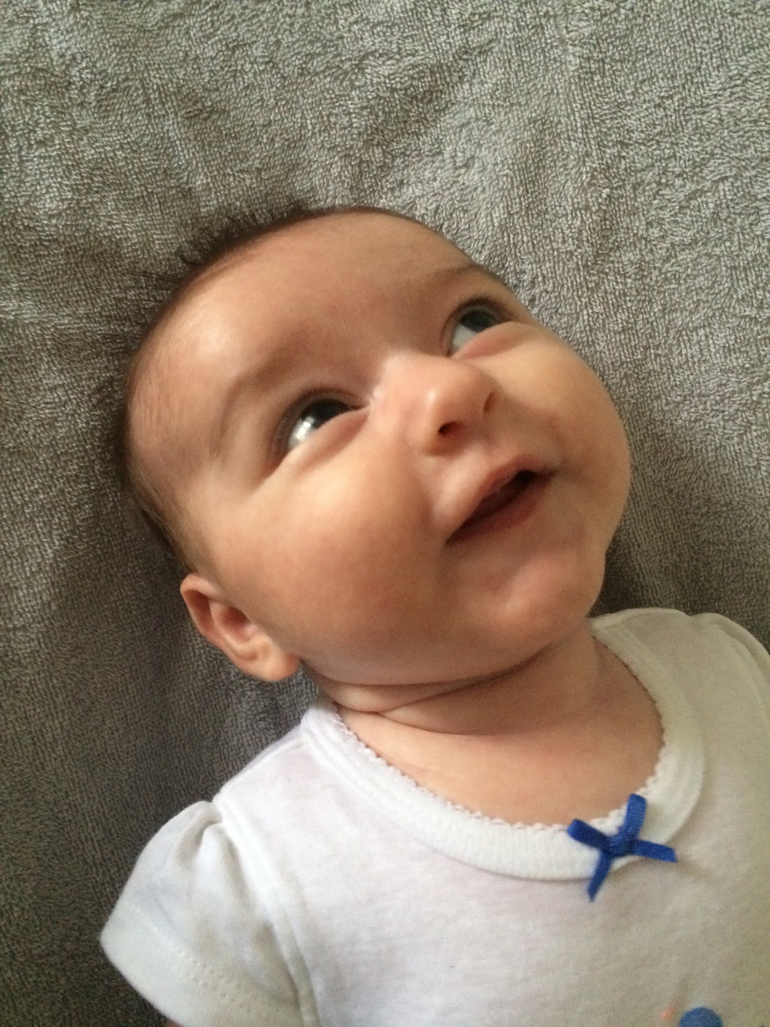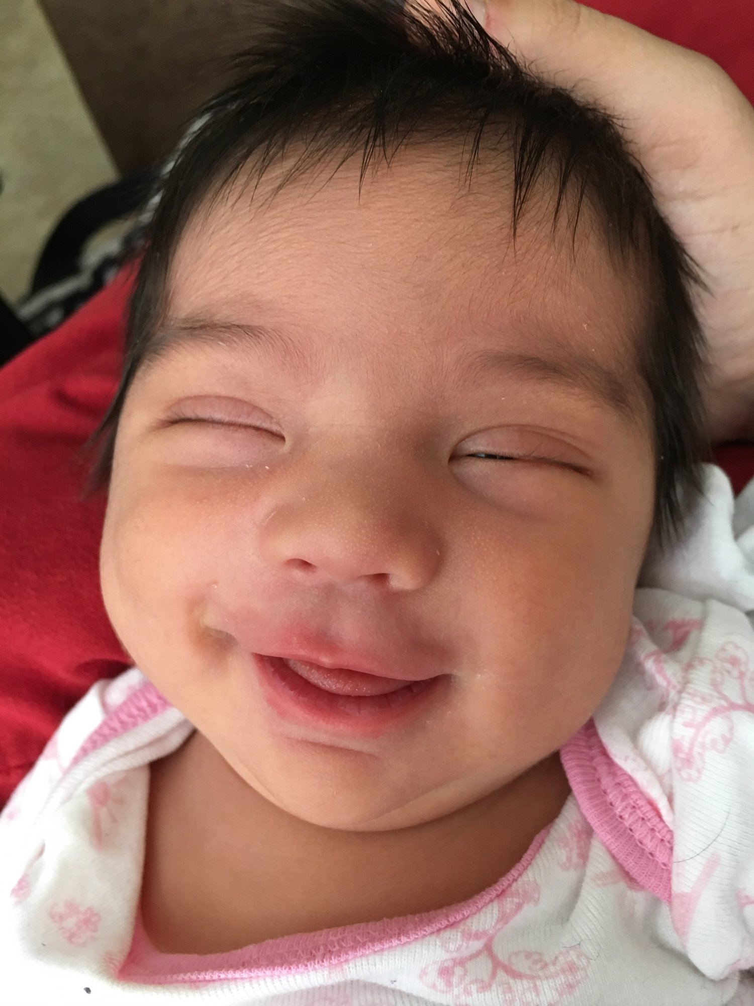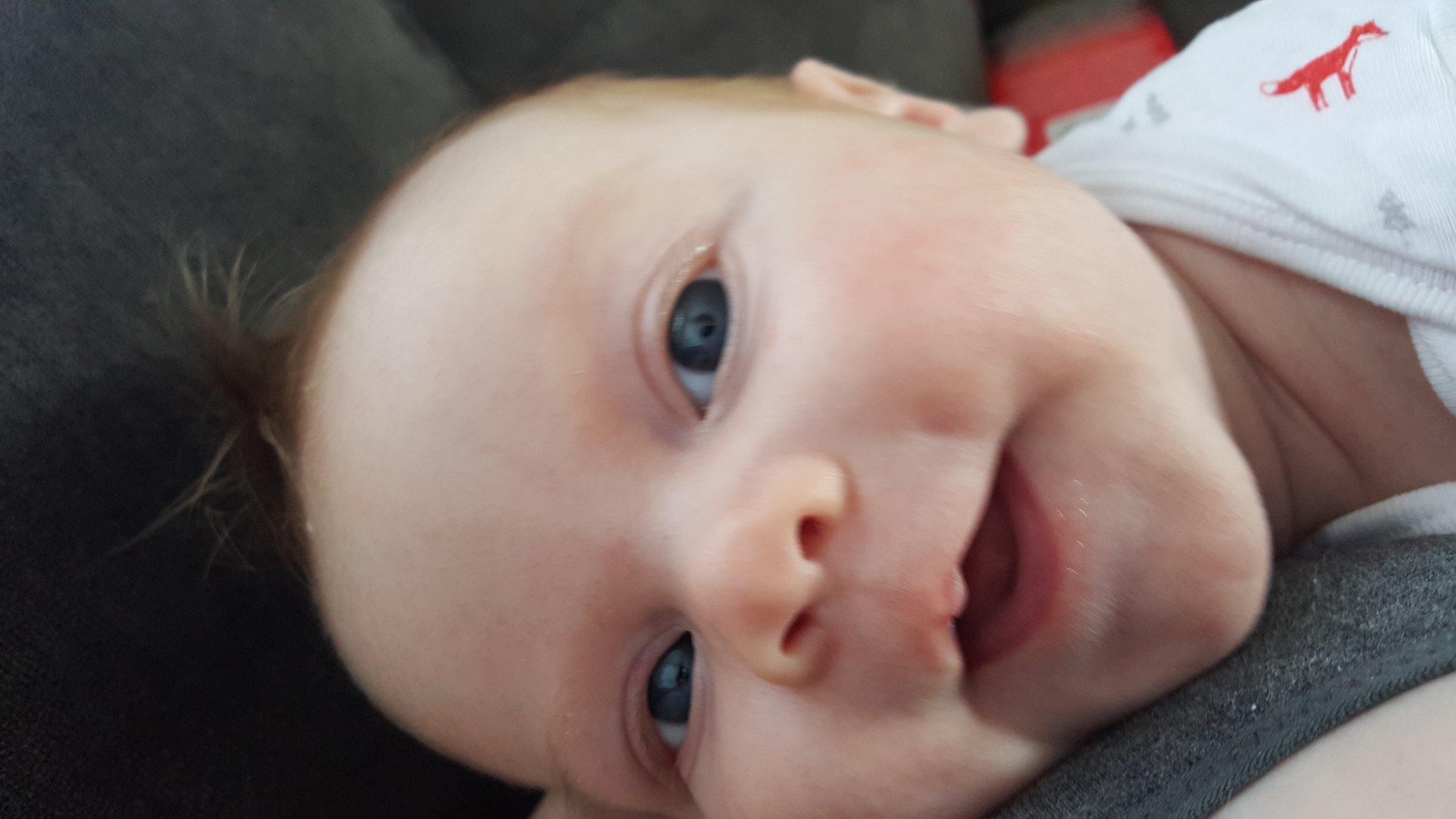 Riley doesn't really smile very much yet but we have gotten these so far. She is always scowling so daddy was gonna make a sad face with her and she ended up cracking a smile instead!