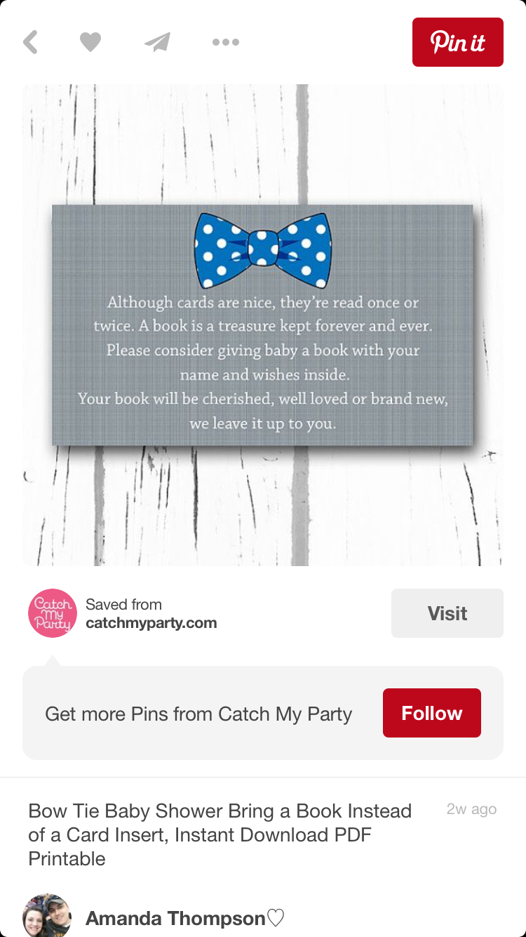 I saw this idea on Pinterest and I loved it! My husband not so much but I'm ignoring his opinion on this one I am so going to ask my mom to make sure she puts a suggestion in the invitations. I did not even think to look on Pinterest for cute ideas to write it out. And whomever said to just register for books, you are a genius and I love because I would have never thought to do that. @jlgriff11 I am team books over cards with you!