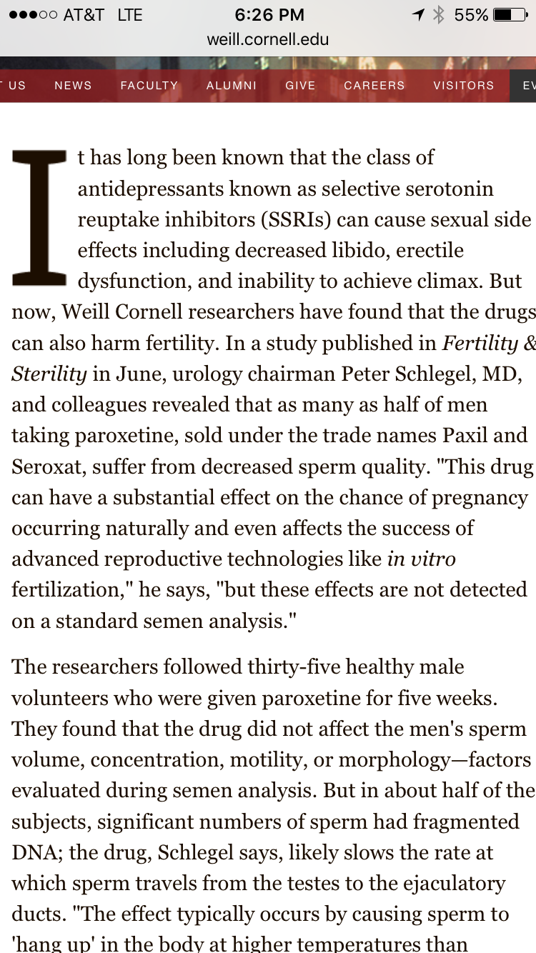 Omigod you guys. I feel like I just discovered the root of (most) of our problems. DH is taking Paxil, and from what I'm reading, it can affect sperm quality as well as make it difficult to climax. I'm so mad at myself for not thinking of this sooner (I'm a pharmacist for goodness sakes!). Just talked to DH and he agreed to taper off for next month's TTC (don't worry-MD approved taper and discontinuation of med).
