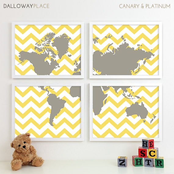 Finally making some progress in decisions for the nursery! We've decided on this map collage (changing the colors to zigzags a capri blue and the map parts a charcoal) for the middle of the one long, windowless, wall. We're then getting the three little quote signs (colors changed to match the map) and I envision having some floating shelves with blocks spelling out his name and maybe some little travel trinkets. At first I envisioned it all on the same wall but I think it'll end up being too much for one wall and we'll just spread the quote signs and floating shelves around the rest of the room.