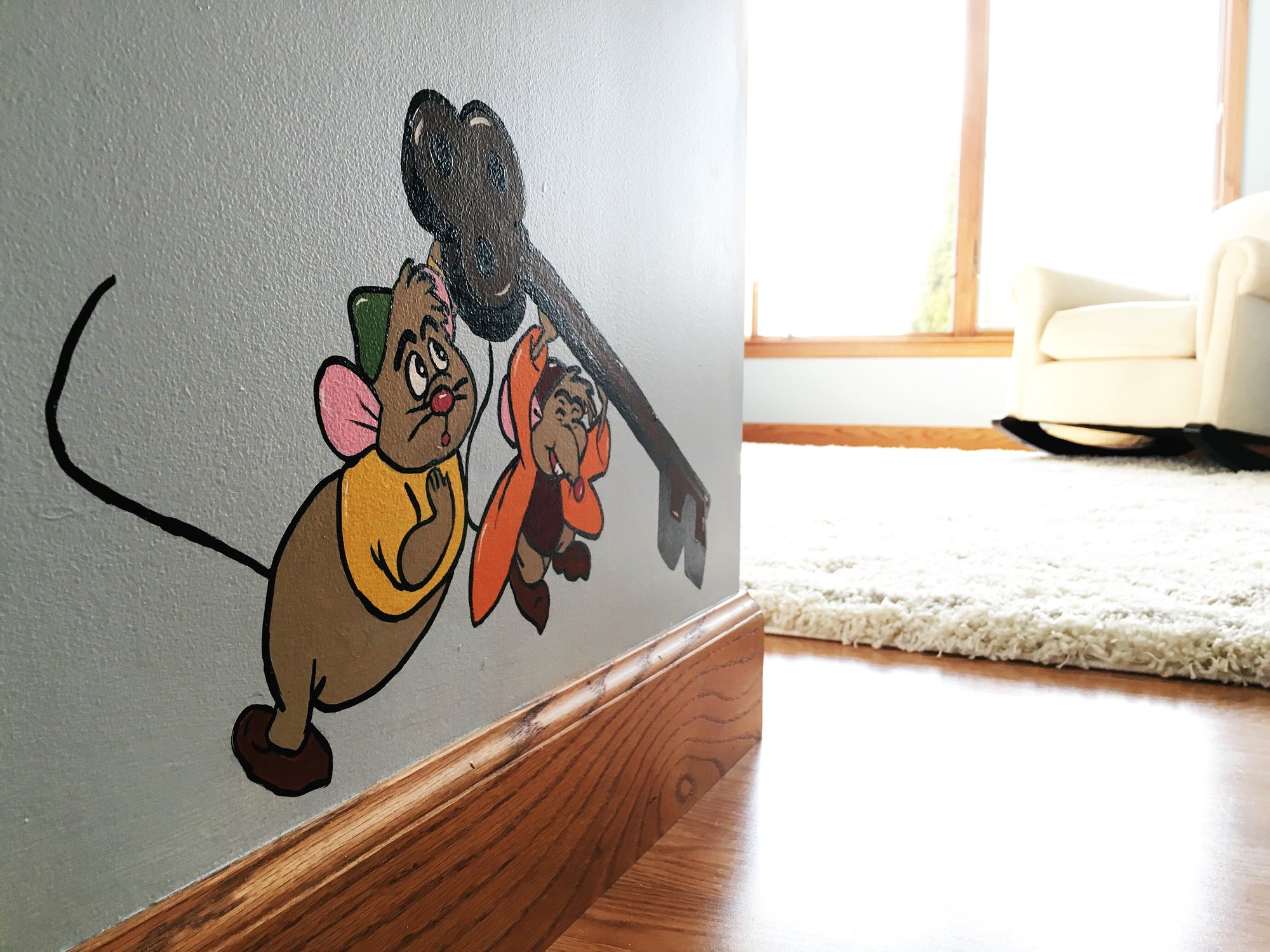 @amangels2 A few! We have the cat, Lucifer, sleeping near the crib, and a tone-on-tone mural of Cinderella's castle above it (which was original to the room - for DD1).
