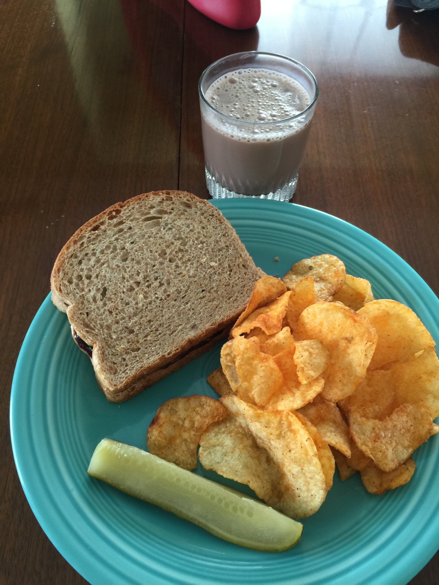 I am having pb&j, bbq chips, a dill pickle, and chocolate milk for lunch and it is awesome! I also think that combo--especially the chocolate milk and dill pickle--would turn my stomach rather than satisfy it if I wasn't pregnant!