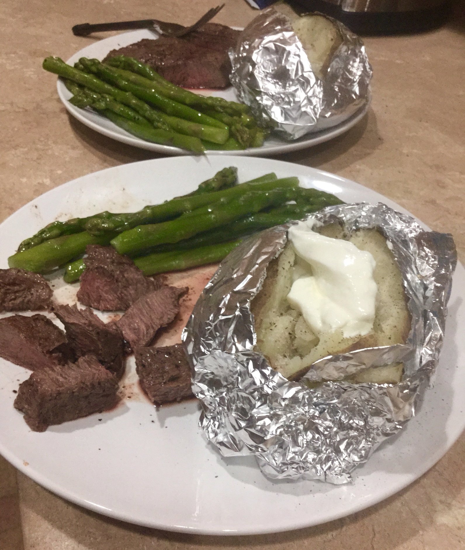Had a change in our meal plan and I wanted to share because it was simple and delicious! I took 3 frozen chicken quarters (thigh/drumstick) and put them in the bottom of the crockpot. I drizzled them with olive oil and liberally sprinkled them with paprika, salt, pepper, onion and garlic powder. I topped the chicken with 1 sliced onion and 4 foil wrapped potatoes. I put it in the crockpot on low around 730 AM (before work) and we didn't eat until close to 6. It was juicy and wonderful. I just heated up some frozen veggies to go with it and everyone is happy. Bonus points as it's ingredients that we almost always have on hand. I was just not in the mood for bean soup. The corn bread was still on point though!