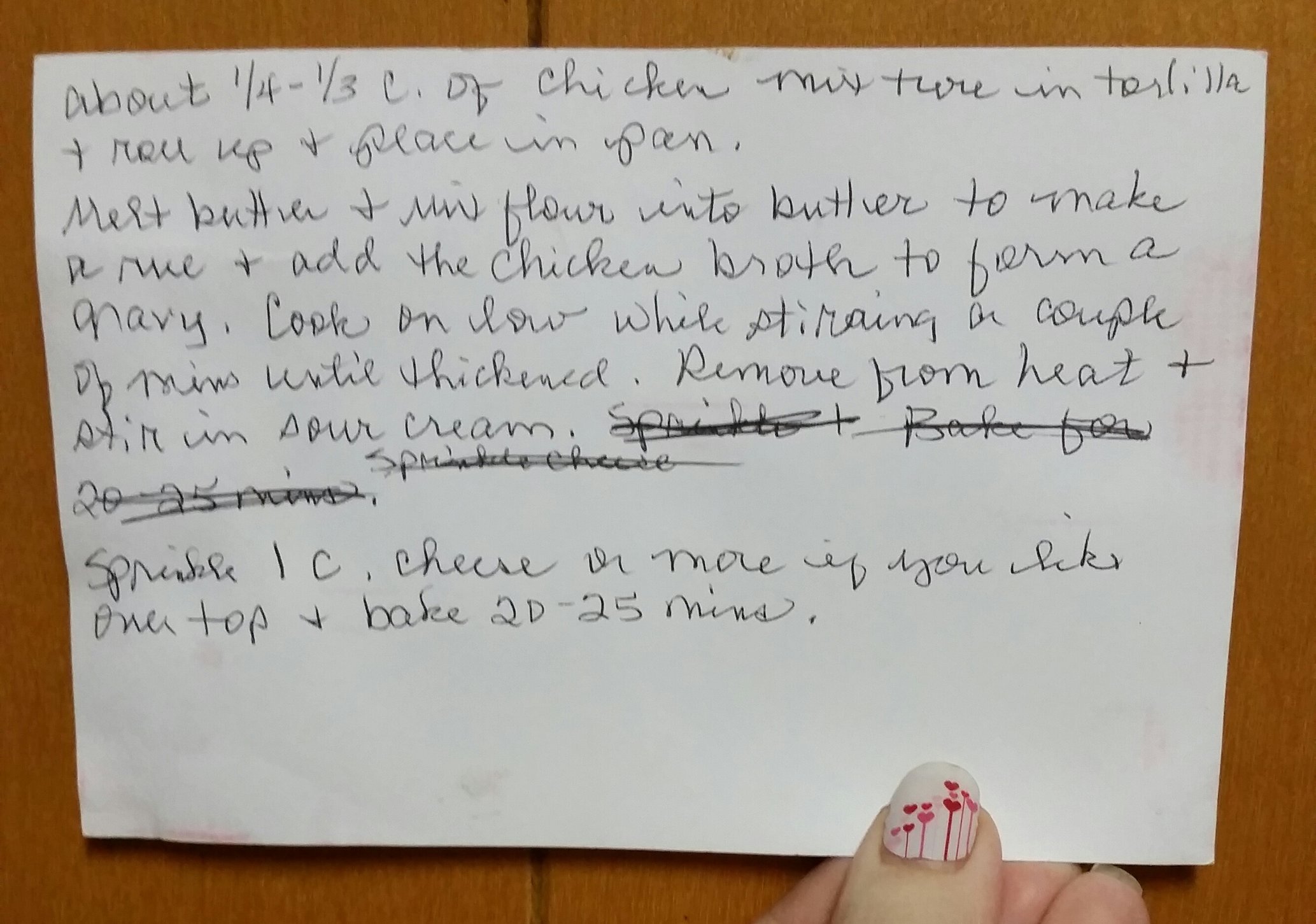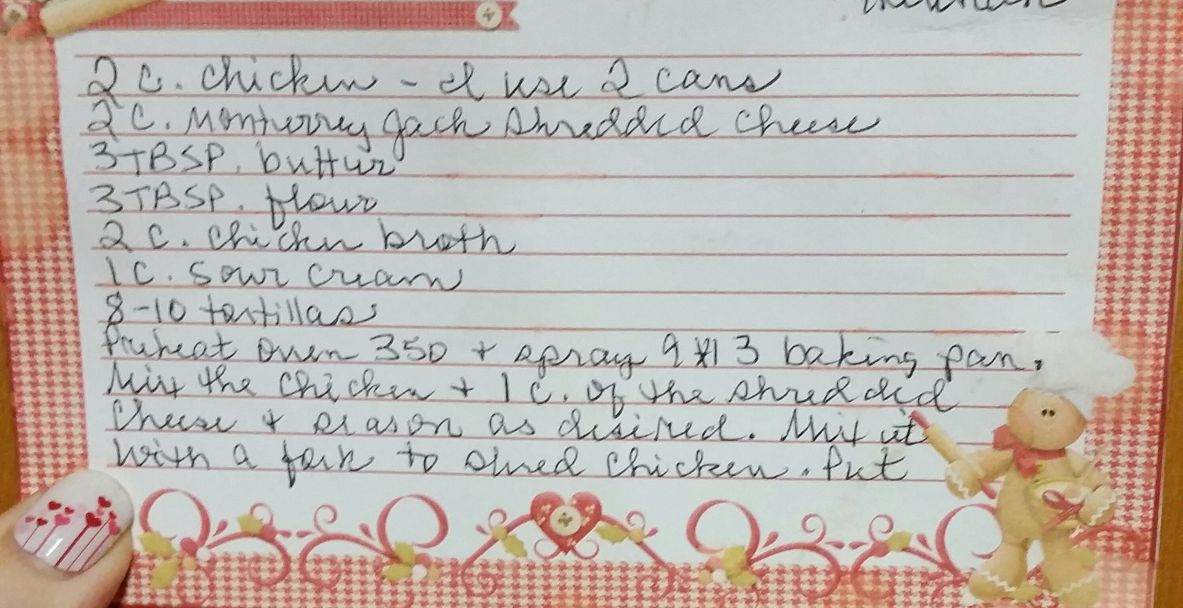 Cook on low for 6-8 hours (up to 10 is fine). 30 mins before serving, shred chicken with a fork. You can do this right in the pot or take it out and then return it. Mix altogether. Top with sour cream, cheddar cheese and green onions (or cilantro).