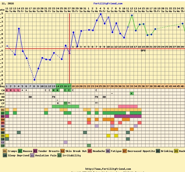@housewifehobbyist I think the O around CD 17 makes more sense, but I also don't think it's entirely impossible that you Oed a week later and your post-O temps just didn't rise a ton. Try to visualize your cover line around 98.2 -- it doesn't look that crazy. Granted, your CM lines up better with the first O date, but the fact that you had a negative HPT at 11 DPO makes me think that later O isn't entirely out of the question. Any reason why your earlier temps may have been a bit warmer or your later temps may have been a bit cooler? Temps are funny things sometimes -- they're helpful guidance but they're imperfect. In any event, I definitely wouldn't count yourself out yet.