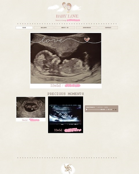 Here is a screenshot of the website, created with Wix (free!). Once baby arrives, she will have her own Facebook account (so that I don't flood my own with pictures). Links on top include: gallery, about us, guestbook, and contact us.