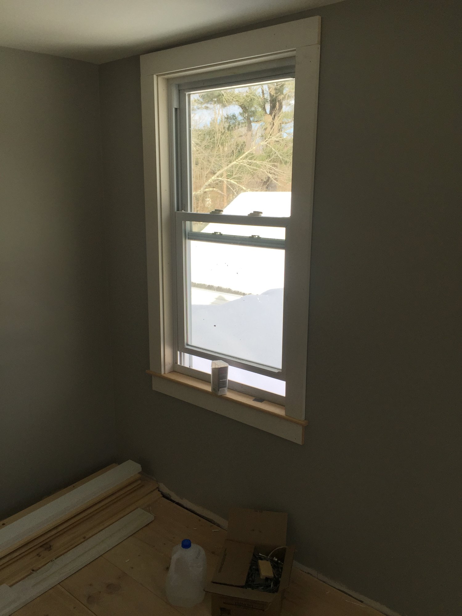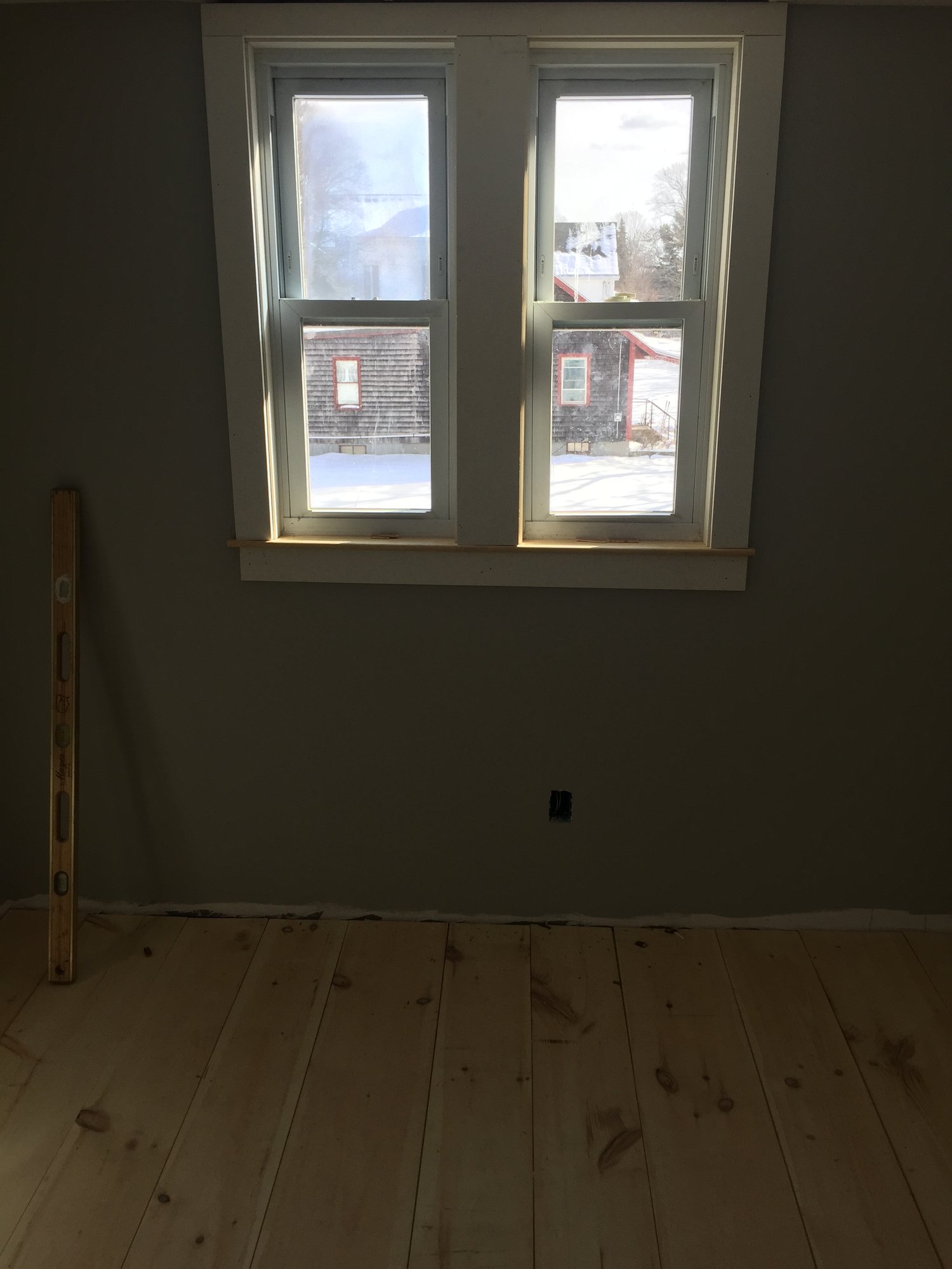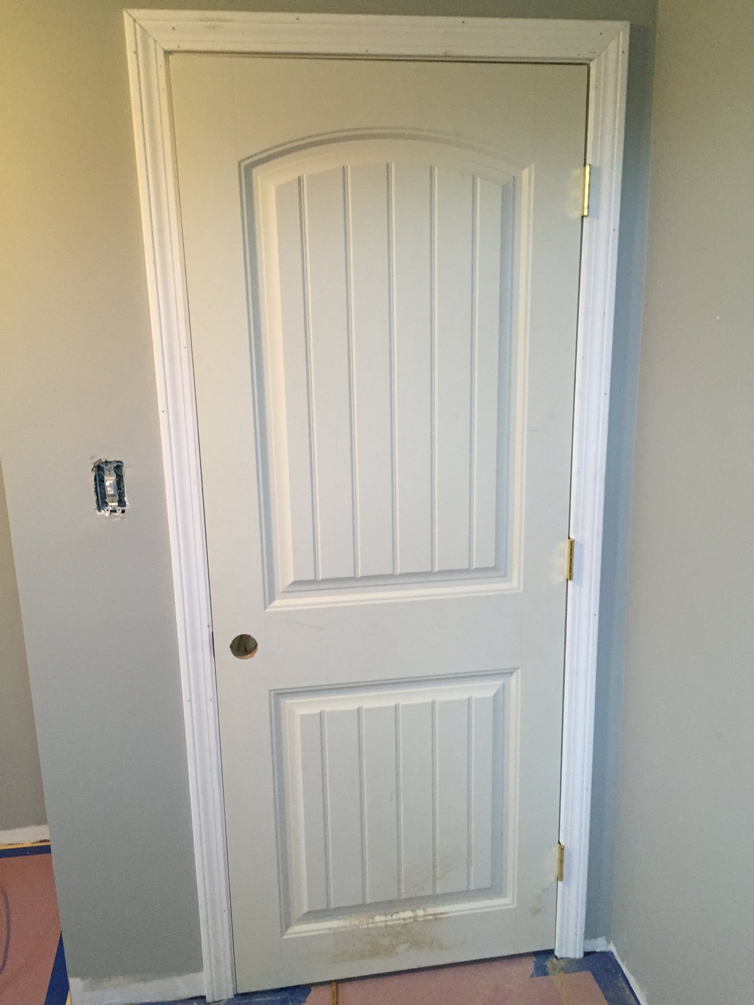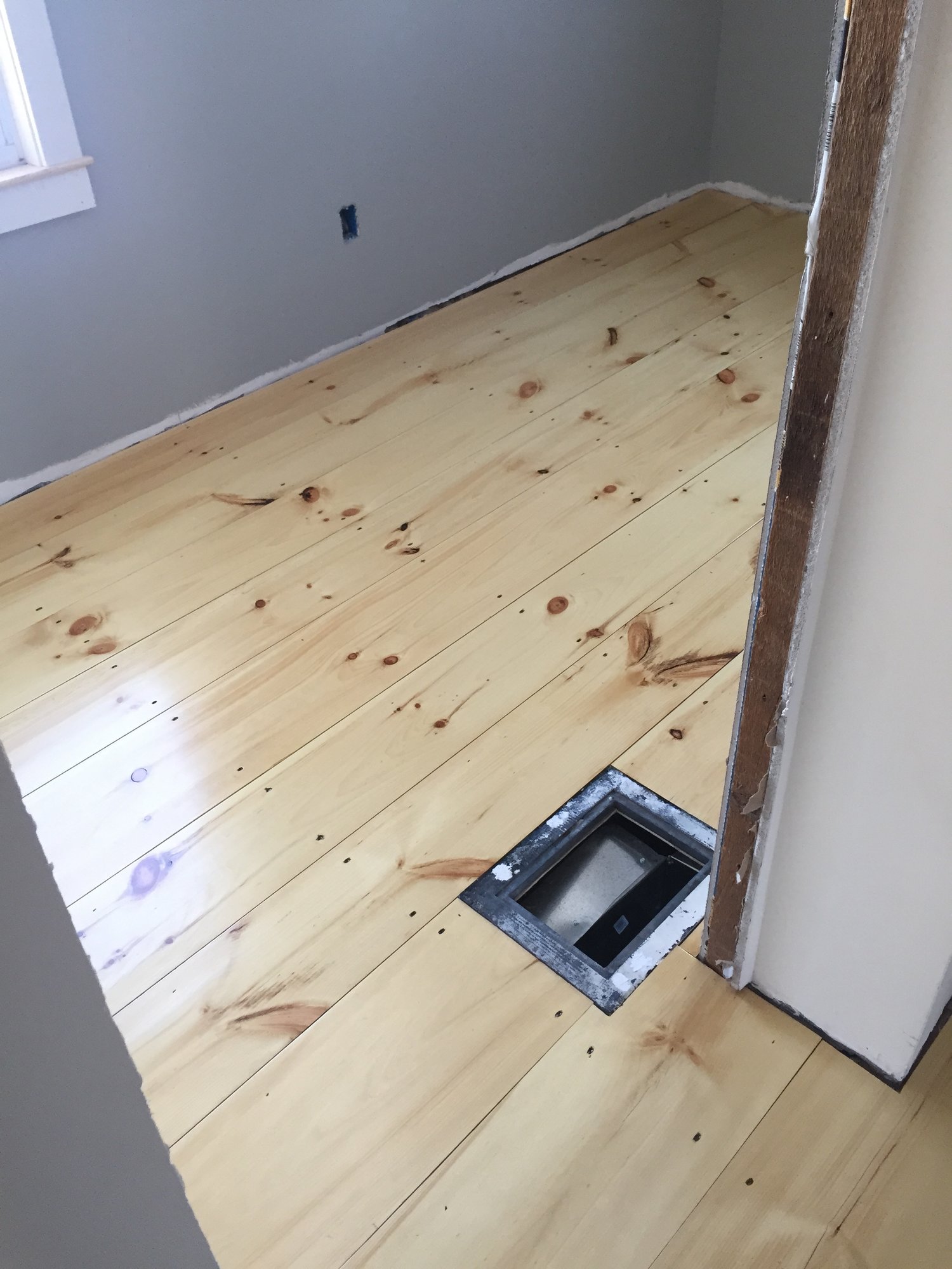 Floors and installed, sanded and finished, walls are in and painted, door was just put in! Next up is trim, painting the door and a light fixture! ps it's a light gray but these pictures make it look super dark