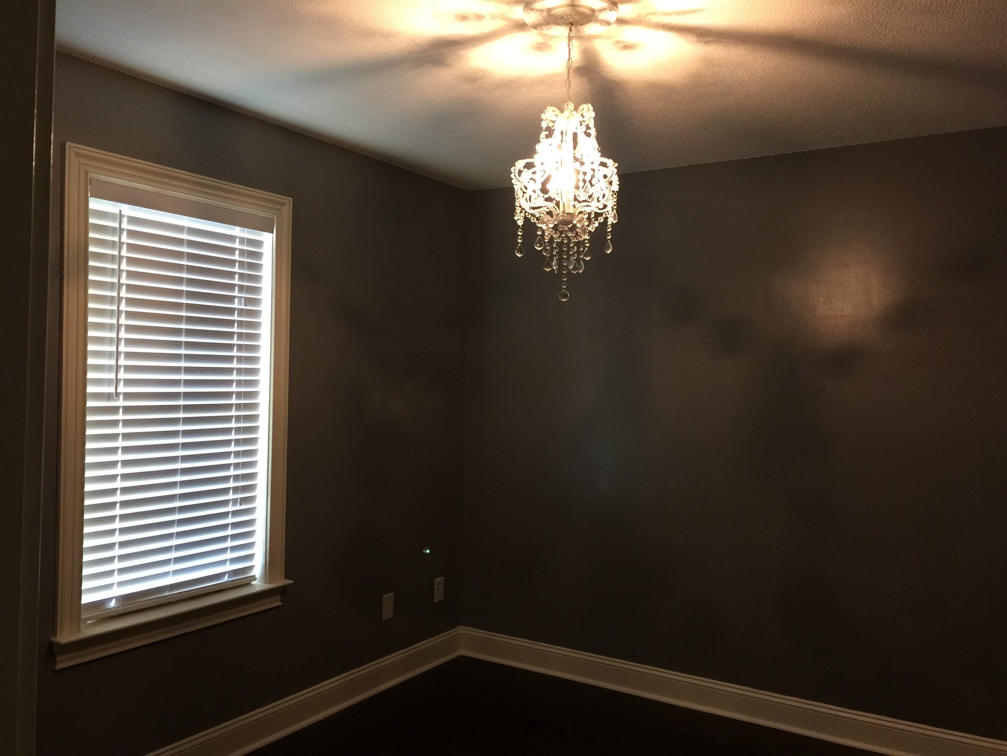 We finally have the floor down, walls repainted (the first gray we did was blue... And this picture makes the gray look SUPER dark. It's paler than this), and chandelier hung!
