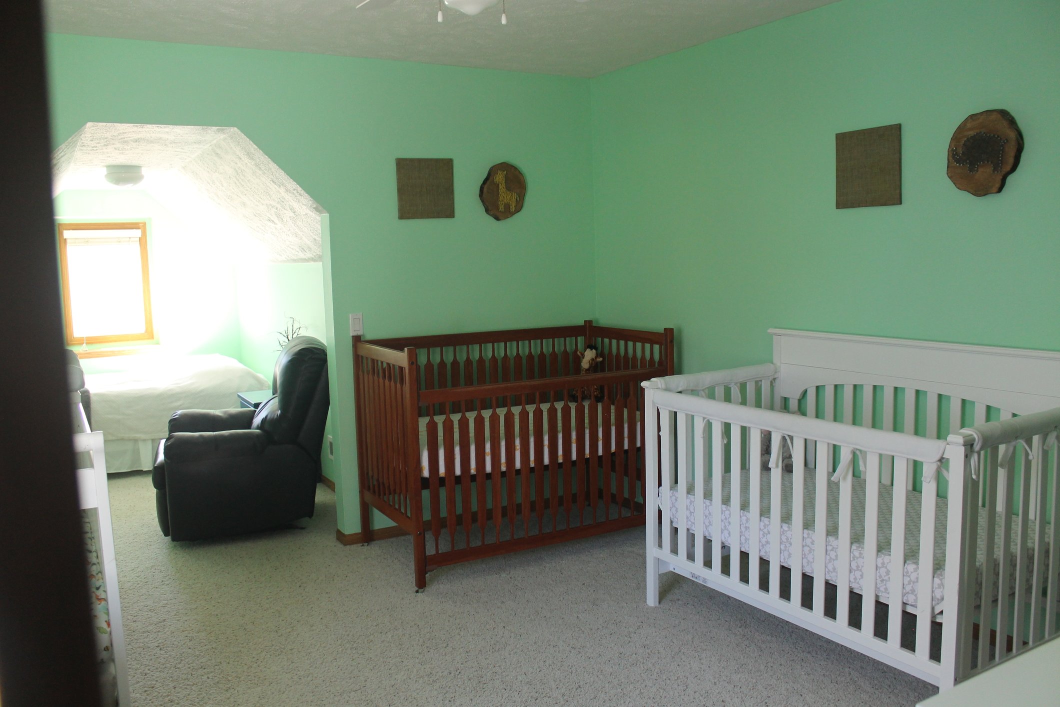 It's about done. Need to put a curtain on the small window (mom is making) and fleece crib rails. Burlap canvas will have their first initial once their names are public. Walls are sparse so I can add newborn pictures later.