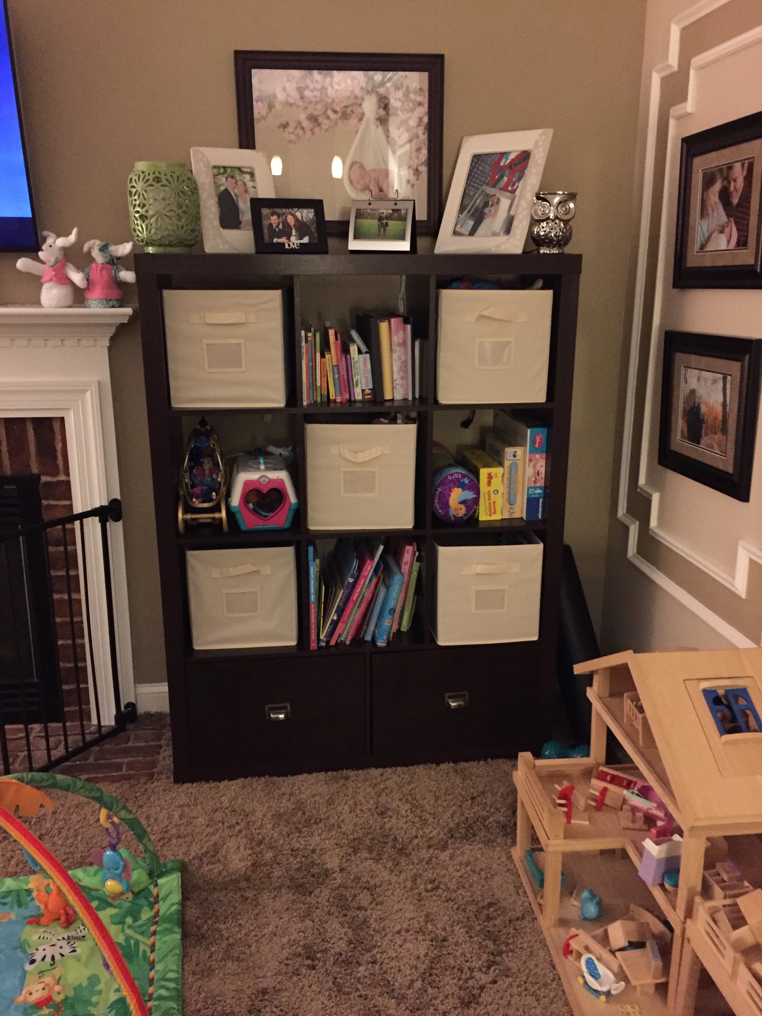 Anyway we just got a cube storage last month. It's from Costco. I like it because it goes with our decor, the cubes are bigger than others I've seen, and it fit the space. It has enough cubes for all 9 slots but I wanted the book space. I'll attach a pic.