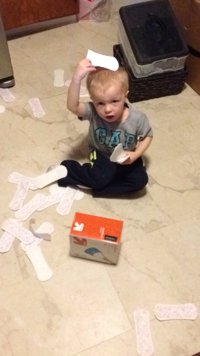 Wanted to share this with you all. We are currently doing a bathroom reno and all of our things are in the kitchen (good times). I turned my back for one sec as I'm cooking dinner and DS found himself some "stickers"