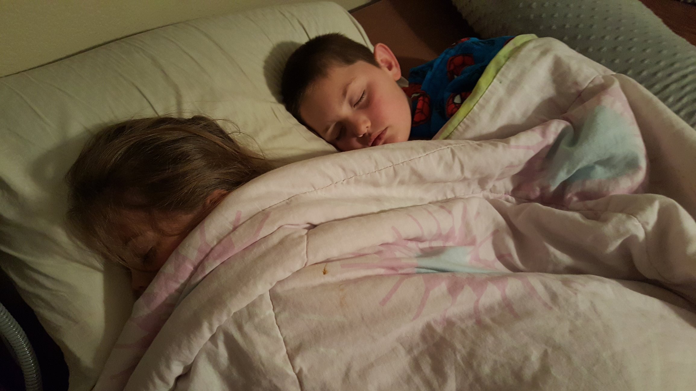 The kids made their way into my bed again last night. Just because. I tried to get comfortable but there was no way. My pregnancy pillow is huge, I'm huge, they're not tiny and it just wasn't working for me. So I kicked them out of my bed at 3 am. I got up in the morning before them and started getting myself ready. When I went to wake them up, I realized they were both in my bed, snuggled up together on about a third of the bed. And when I tried to wake them, I had to laugh. DS wanted nothing more than to throw his arm over DD to snuggle up and fall back asleep. DD was having NONE of that and kept pushing him away.