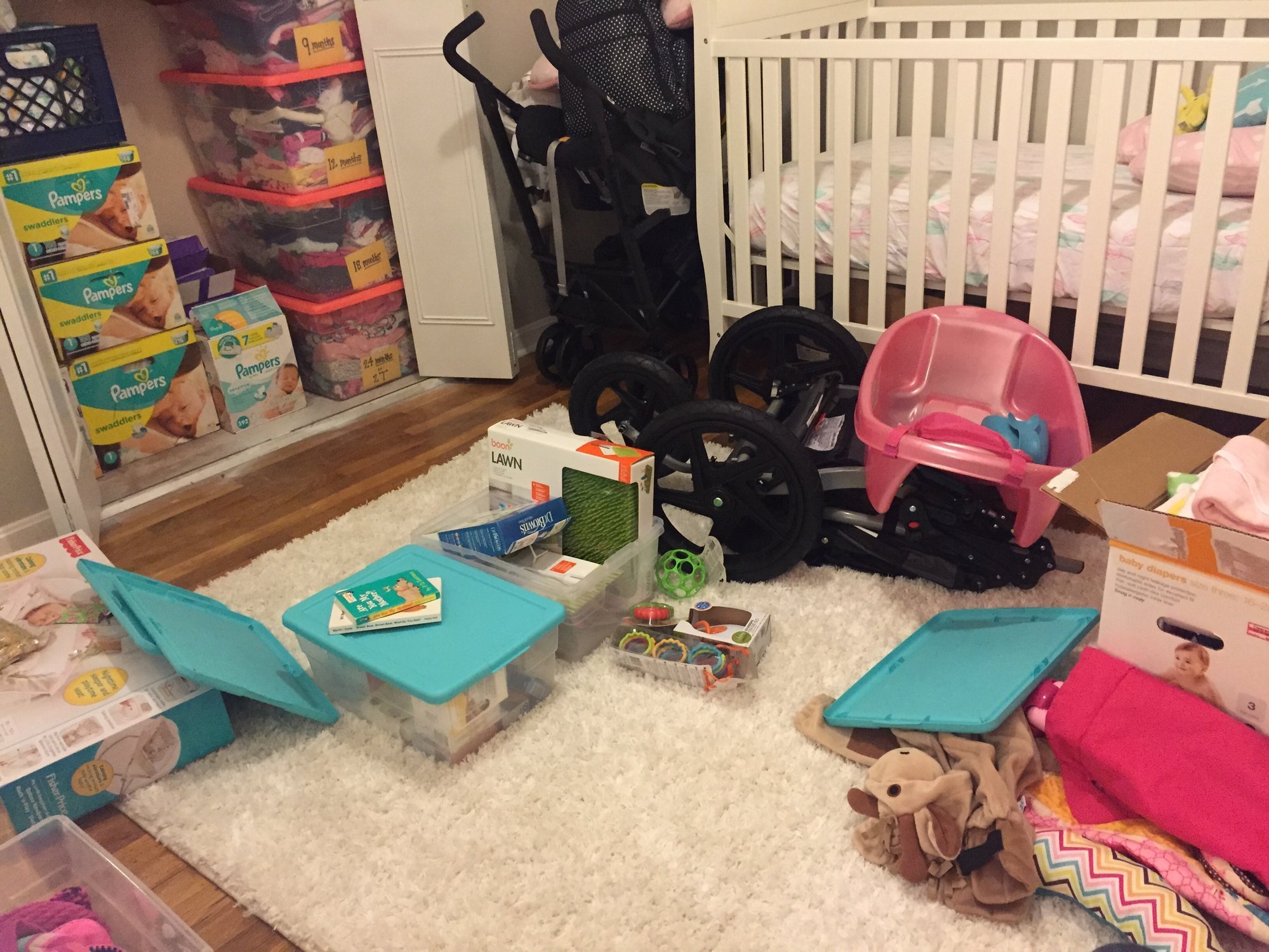 I sometimes feel like when I clean/organize it ends up messier than it was when I started. This floor was completely clear earlier.. sigh. For such small people, why do babies have so many things?