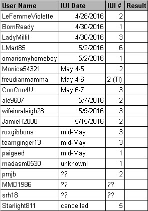 Of course, thank you @Monica54321 for your wonderful spreadsheet! I updated my IUI date on there!
