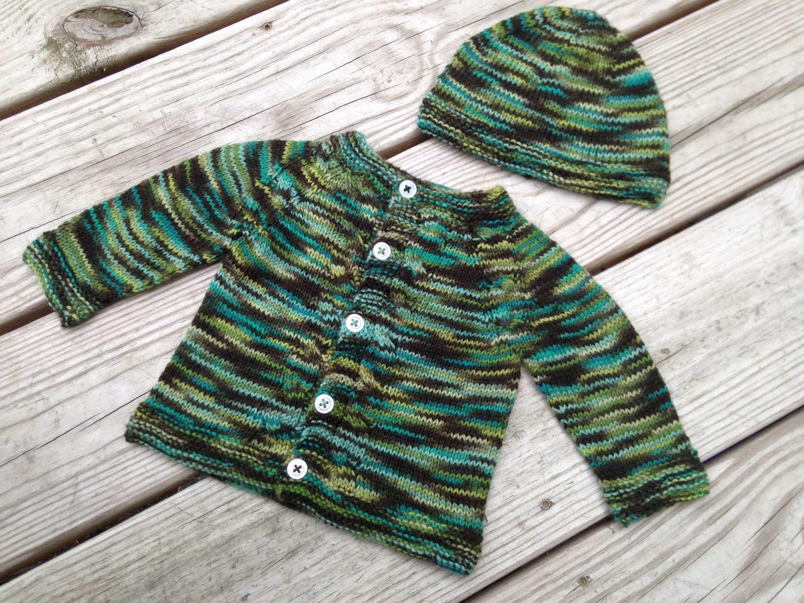 Here's the finished Sunnyside Cardi and a matching beanie. We're team green, so I figured this could work for either sex. The colorway is Tree Frog, it's a KnitPicks superwash merino sock yarn I bought a good five years ago when I was doing a lot of socks!