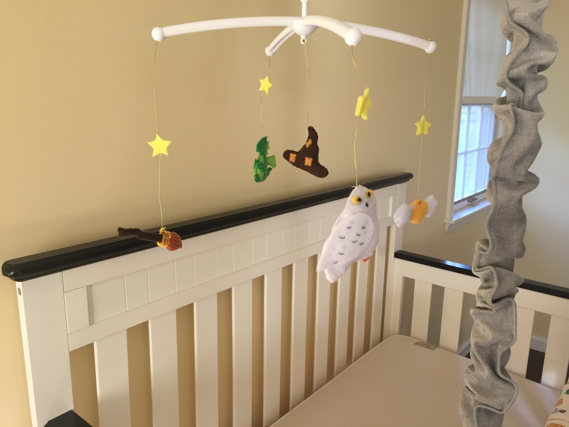 Finally finished my Harry Potter mobile! Kind of tough to see them all but I ended up with Hedwig, a snitch, a broomstick, a dragon, and the Sorting Hat. I feel like I need something to cover the top part but I have no ideas! Almost done decorating and I couldn't be more excited!!