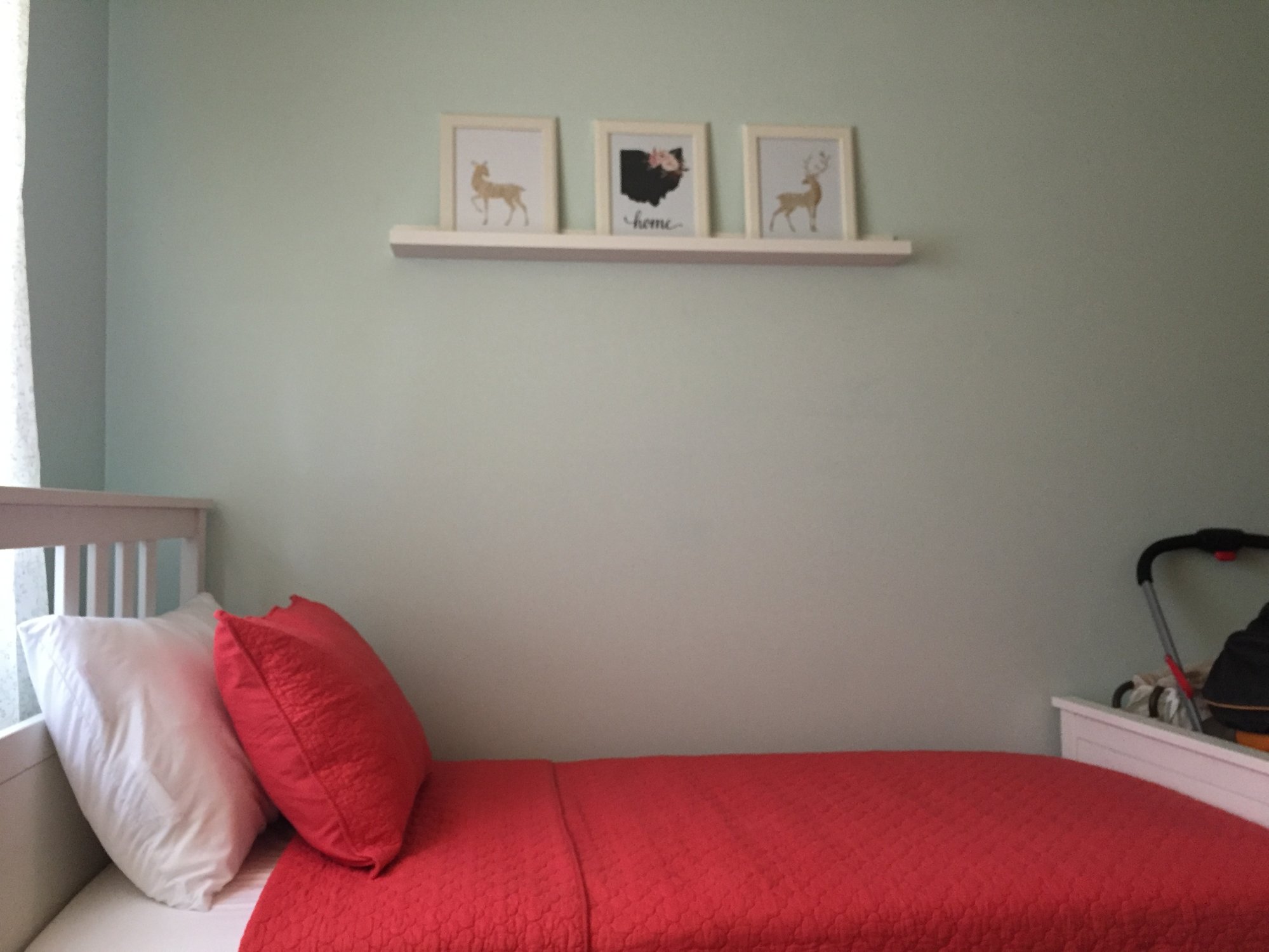 So we, or I should say I, was thinking of doing a mermaid theme but I just started the nursery this weekend and decided to do a floral theme. Mint and pink with accents of gold. We will need to keep our guest bed in here until my sister and brother in law visit at the end of June. But I'm so glad I at least got the walls painted