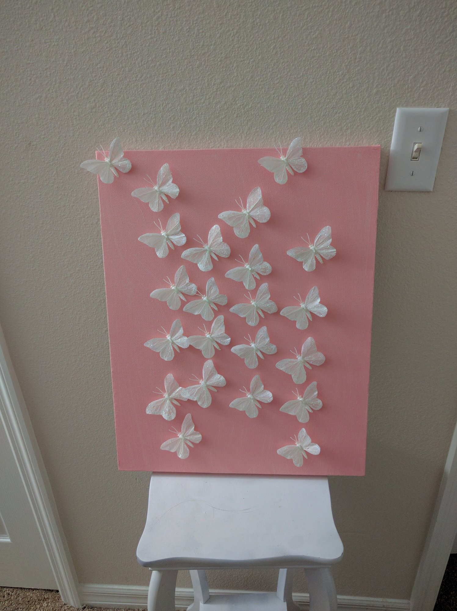 It honestly was so easy, I'm sure you could do a mobile! I found the butterflies at Michael's on sale, 9 for $2.99 (I bought 27 but didn't use them all). They are made for flower arrangements so they have a thin metal wire you have to cut off. Otherwise the body is plastic and the wings are made from feathers with glitter poured over them. I got a slanted canvas on sale for $5, grabbed some acrylic paint in the color I wanted and painted the canvas. Then I super glued the butterflies to the canvas because I was too lazy to dig out my hot glue gun.