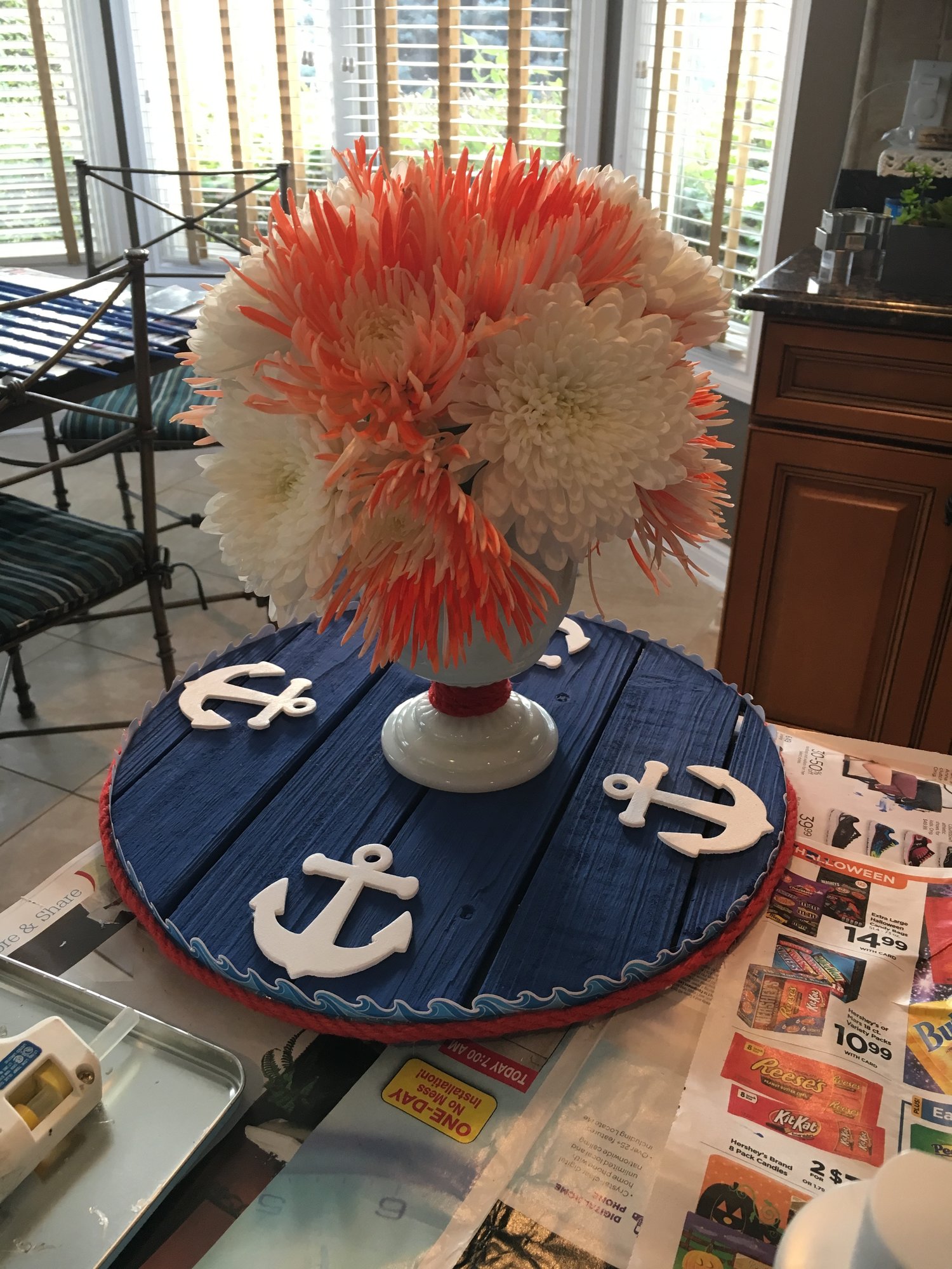 Mom and I spent the day running around doing baby shower stuff, then made a test center piece. The theme is nauticle, when we put the flowers together for real they will be white jumbo mums And light blue hydrangea, not orange spider mums. I'm really excited for the shower now, it's not until the 13th.