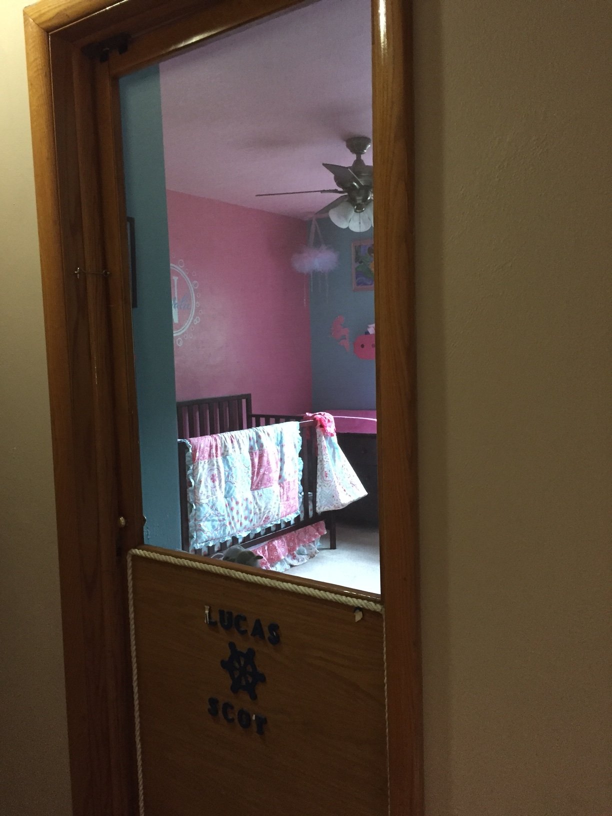 Here's what we had for DS (which is why his name is still partially on the door, LOL, we are still trying to figure out the best way to get that off and replace it with hers). It is a half screen door with a latch at the top and magnets. We can see in the room perfectly, but there is no way for our four cats to get in there unless we accidentally let one in there. It worked really well for DS. I'm not sure how easy it is to make something like this or what it costs because my dad did it for us, but I thought I'd share.