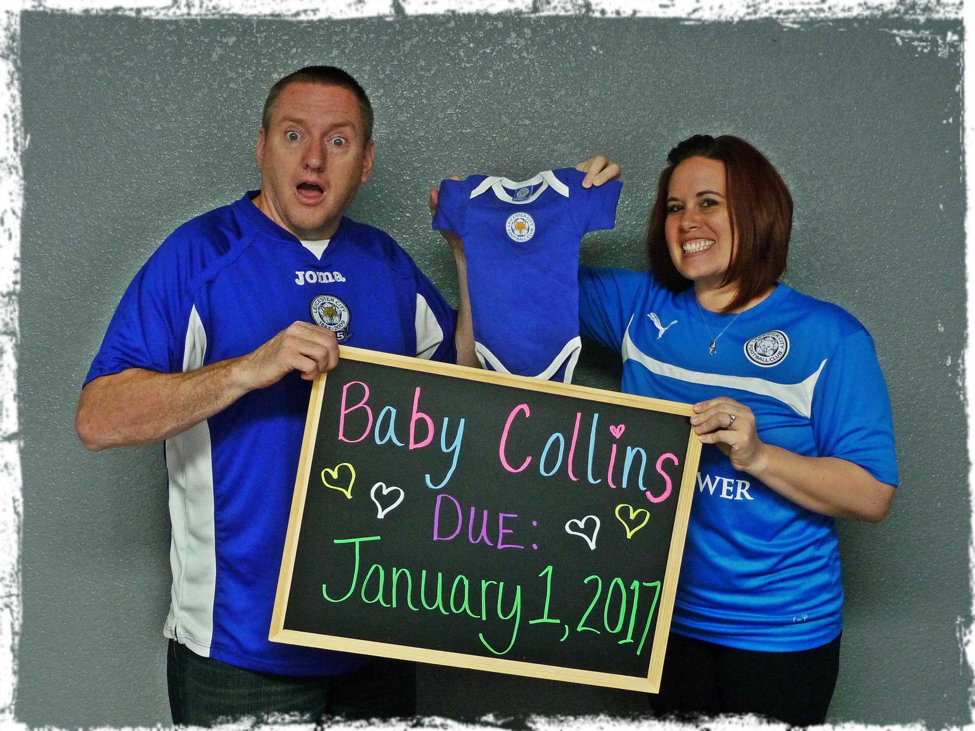 We announced publicly on Monday, with 2 pictures. I posted the pink cat-related one (we have 4 cats), and my husband posted the blue Leicester City Football Club one (you may have heard of them, they are a soccer team from England who just won the Premier League (like the Super-Bowl of soccer) with 5000 to 1 odds! My husband is from Leicester, England). I decided that I don't care if you all see my face and name. Lol. I'm just so relieved that the secret is out!