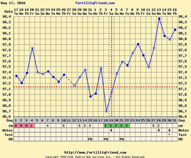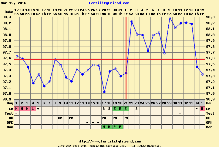 @reneeannemm So sometimes you have a slow-rise pattern and sometimes it just jumps up? I'm just concerned because mine (regardless of what time I take my temperature) jumps up to 98 degree fahrenheit or above (which it's supposed to do I guess?) and stays there except a few erratic temps. But this month it went above my usual cover line (97.5 / 97.6) without hitting 98 for days! And I've heard that lower BBT in luteal phase can lead to higher percentage for MC. So, was wondering if I'd done something. Guess we'll see what next month shows!