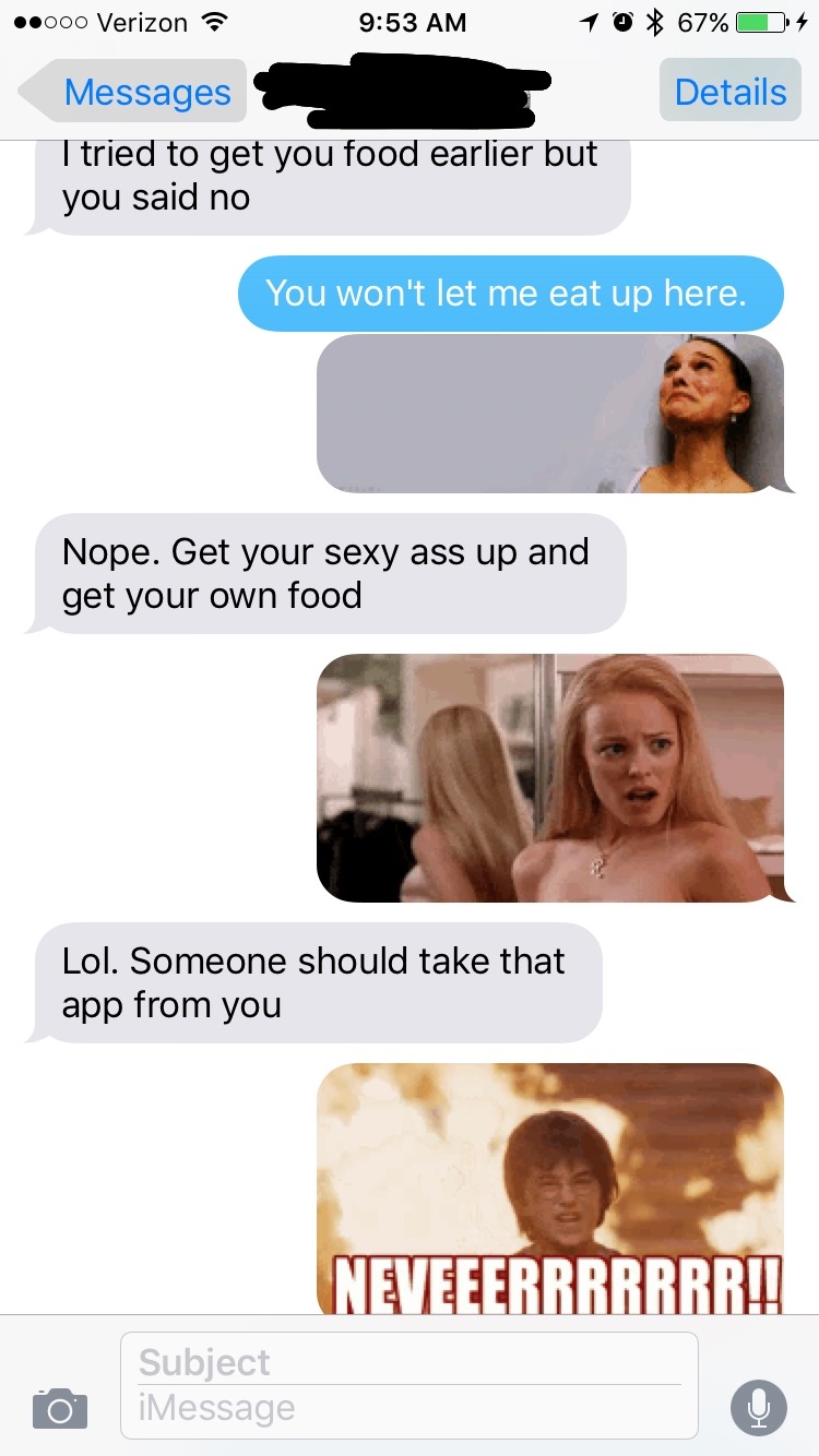 I finally discovered the gif keyboard app. I now include on in every response to DH. I cannot be stopped!