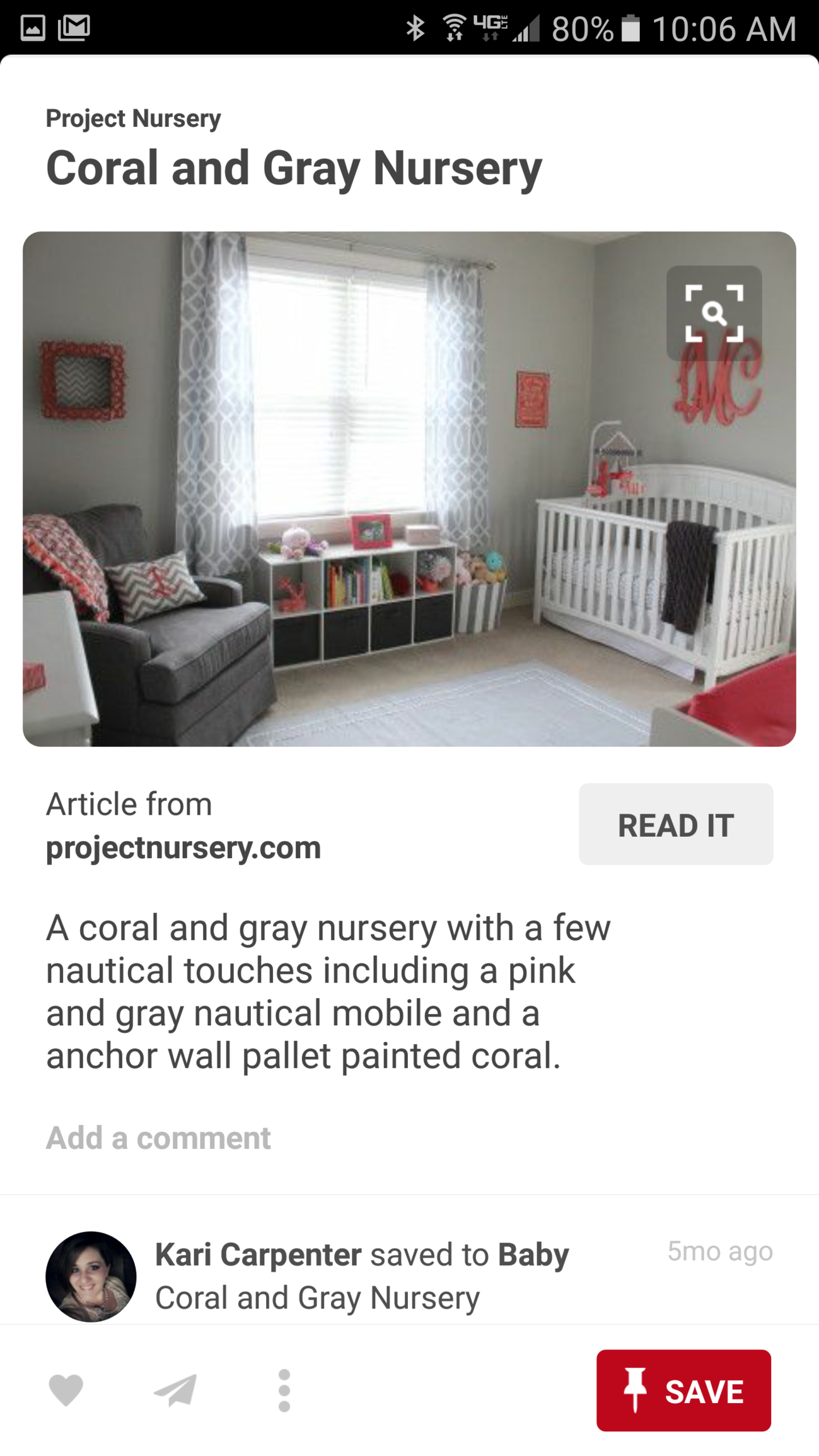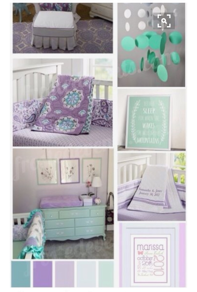 The room is a nice grey with white trim, and it will stay that color. We may move, and if so will still paint the same color. Then I'm thinking white or antique white furniture, and some color accents once we find out the sex of either coral, lavender, or aqua. The flooring is original pine, so it goes with anything.