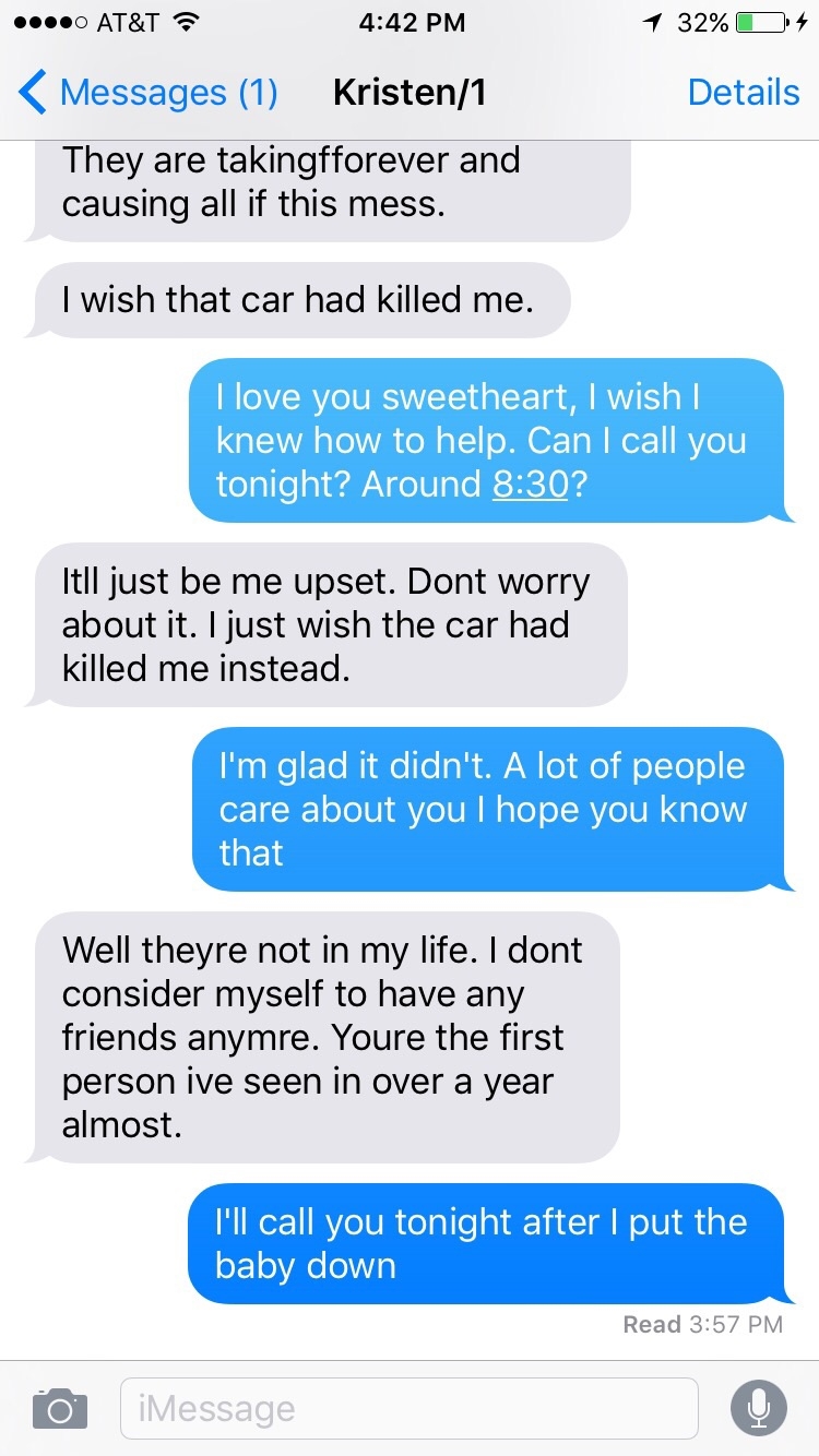 @lovelylauren86 I would straight up ask her if she's thinking of hurting herself. Her texts about wishing the car had killed her are scary. Trust your gut. Tell her you're concerned. You can call the police and request a welfare check on her if you feel she's not being honest and is in some degree of danger. It sounds like she needs serious help honestly. It's a lot of pressure on you- I'm glad you're there for her but hugs to you!! It sounds like a tough situation.