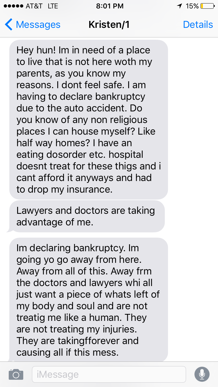 So I need some advise. A friend of mine sent me some pretty concerning texts today and I have no clue how to help her. She was laid off in October and then was in a serious car accident in November and hasn't worked since.
