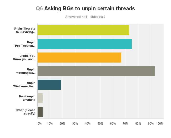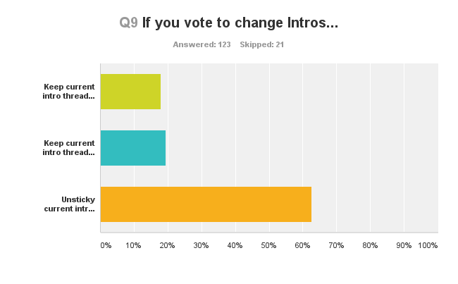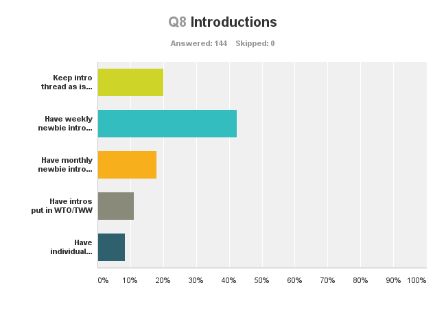 Q8 = Have weekly intro thread (42% vs 20% for keeping as is, vs 18% for monthly vs 11% for WTO/TWW vs 8% for individual threads)