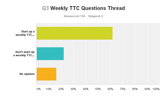 My only question is what would be the difference between the weekly TTC question thread and the chatter thread? Can we just call it the TTC chatter thread and then allow questions on it? But try to keep it strictly TTC related so that it doesn't end up just being a thread where questions get tossed to the wayside.