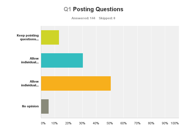 Q1 = Allow individual questions, but point them toward the search function if the question has recently been discussed (50% vs 30% for questions that don't break TOU vs 13% for WTO/TWW)