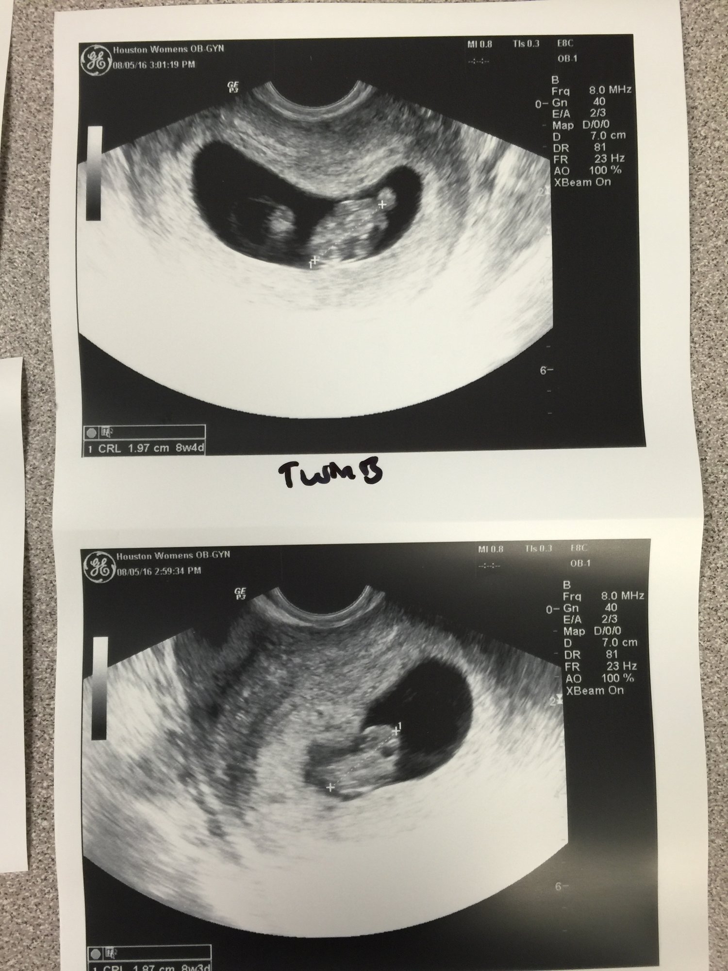 • Had aother ultrasound today! Babies are measuring 9 weeks and growing good :) they really think they are mono di now. And one of them is sideways. So 3 pix. One is twin a and b seperate and the one with them together but not in the same position. U only see the side head viewish. Strong heart beats 179 and 181 :) *grow grow babies grow grow* doing the genetics blood test next week which, since they are identical, should tell us the gender! Yay