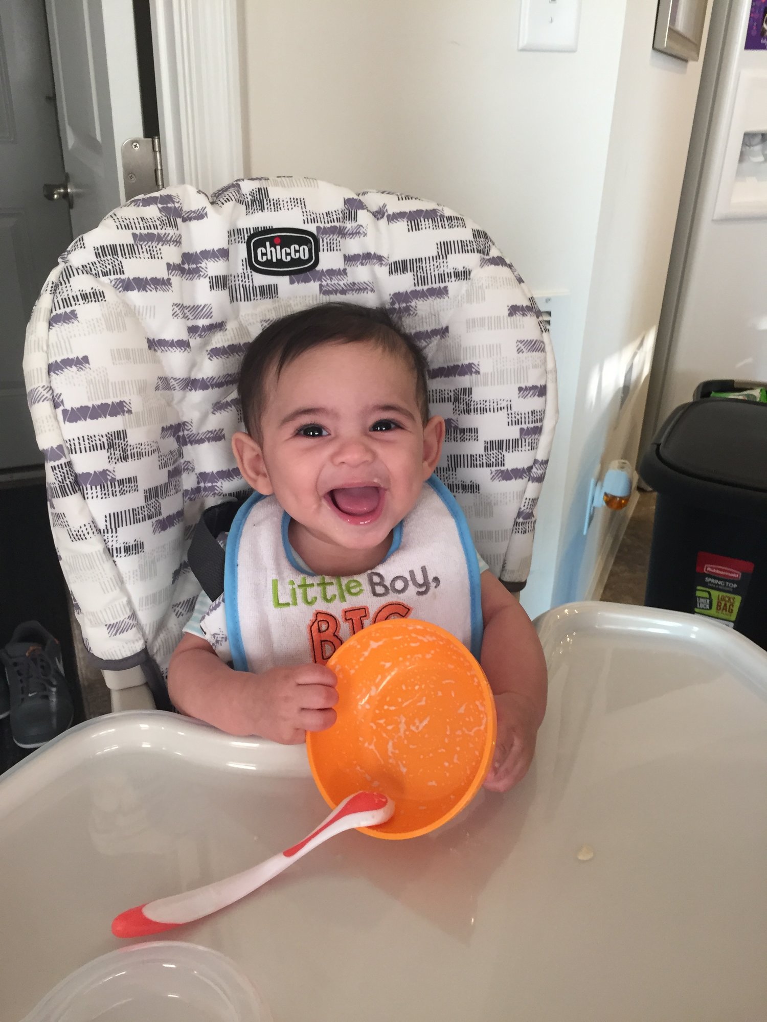 There are lots of other foods we're excited to try, but we've been taking it slow. He doesn't even get the solids every day yet. We're trying to get him used to the idea of food before we introduce it as a regular part of his routine around 6 months.