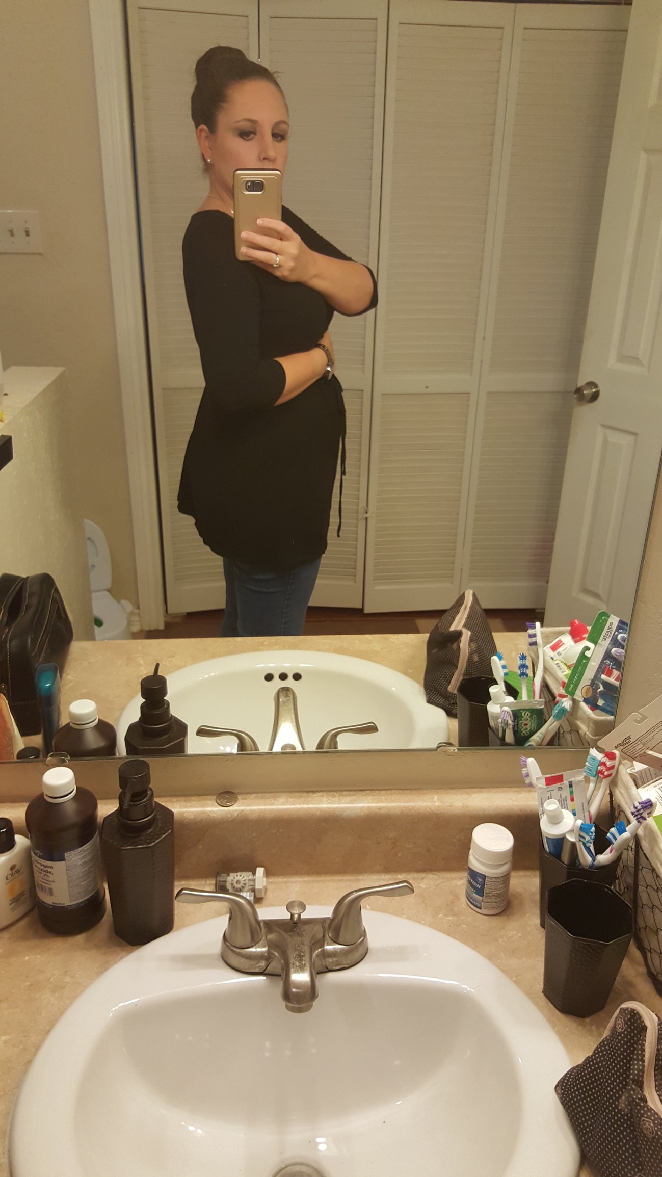 20 weeks 3 days. Trying on my new dress from pink blush maternity. I highly recommend it!!