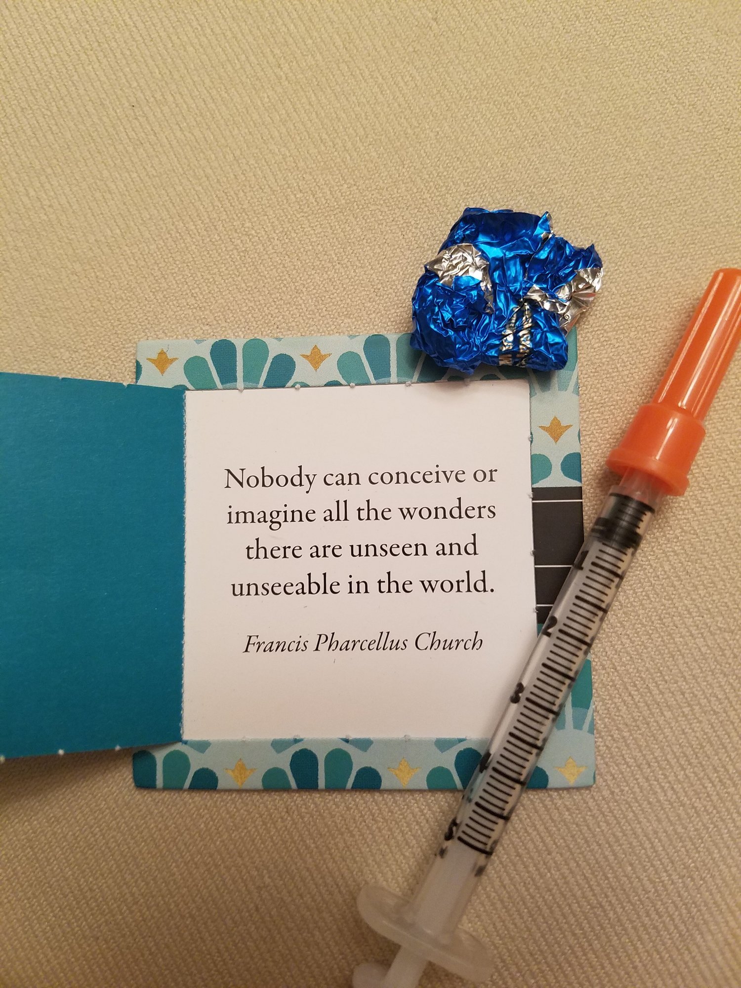 Today is day 4 of Lupron... waiting for my period to start stims. That's a crumpled Dove chocolate wrapper After each shot, DH gives me a chocolate and then opens and reads a little inspirational card.