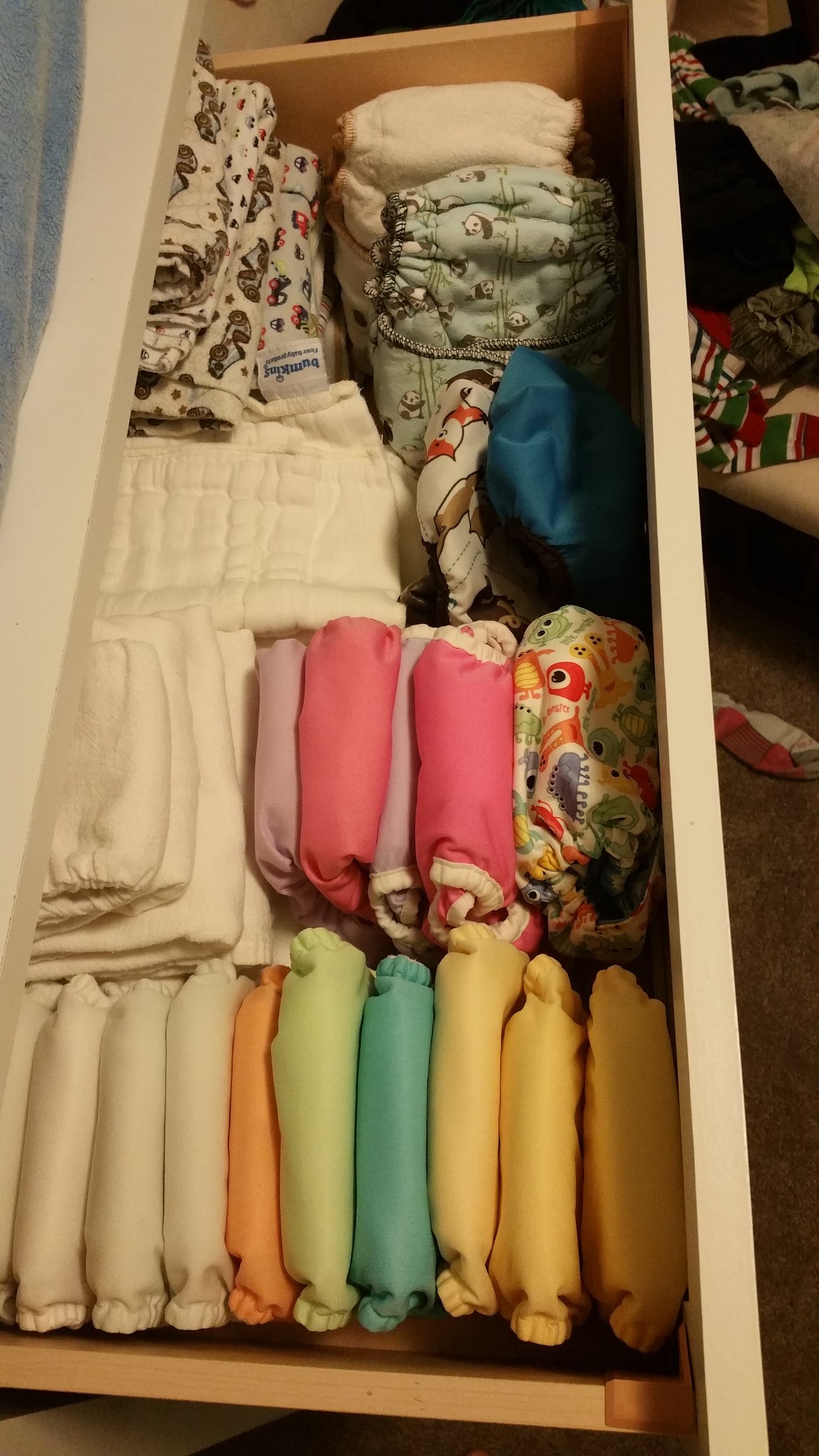 Not pictured are the 10 GMD fitteds and 6 newborn prefolds stashed somewhere else.